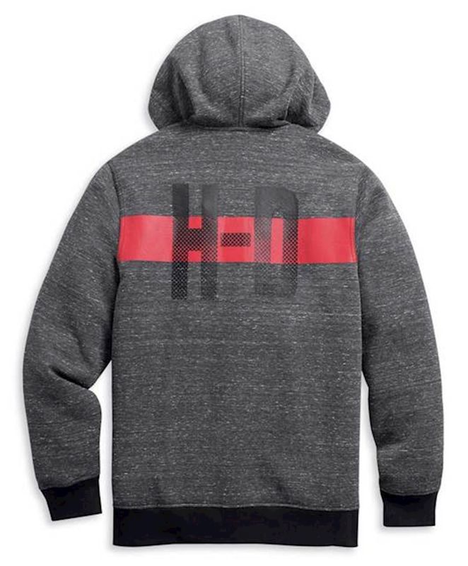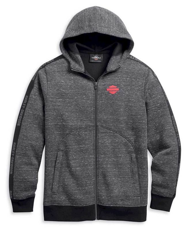 Harley-Davidson® Men's Sleeve Tape Hoodie - Asphalt Heather Gray, 96227-20VM. Made from 77% polyester and 23% cotton bonded fabric. Zipper front with higher chin closure. Zipper hand-warmer pockets. Rib-knit cuffs and waist. Custom woven taping. Embroidered and printed graphics.