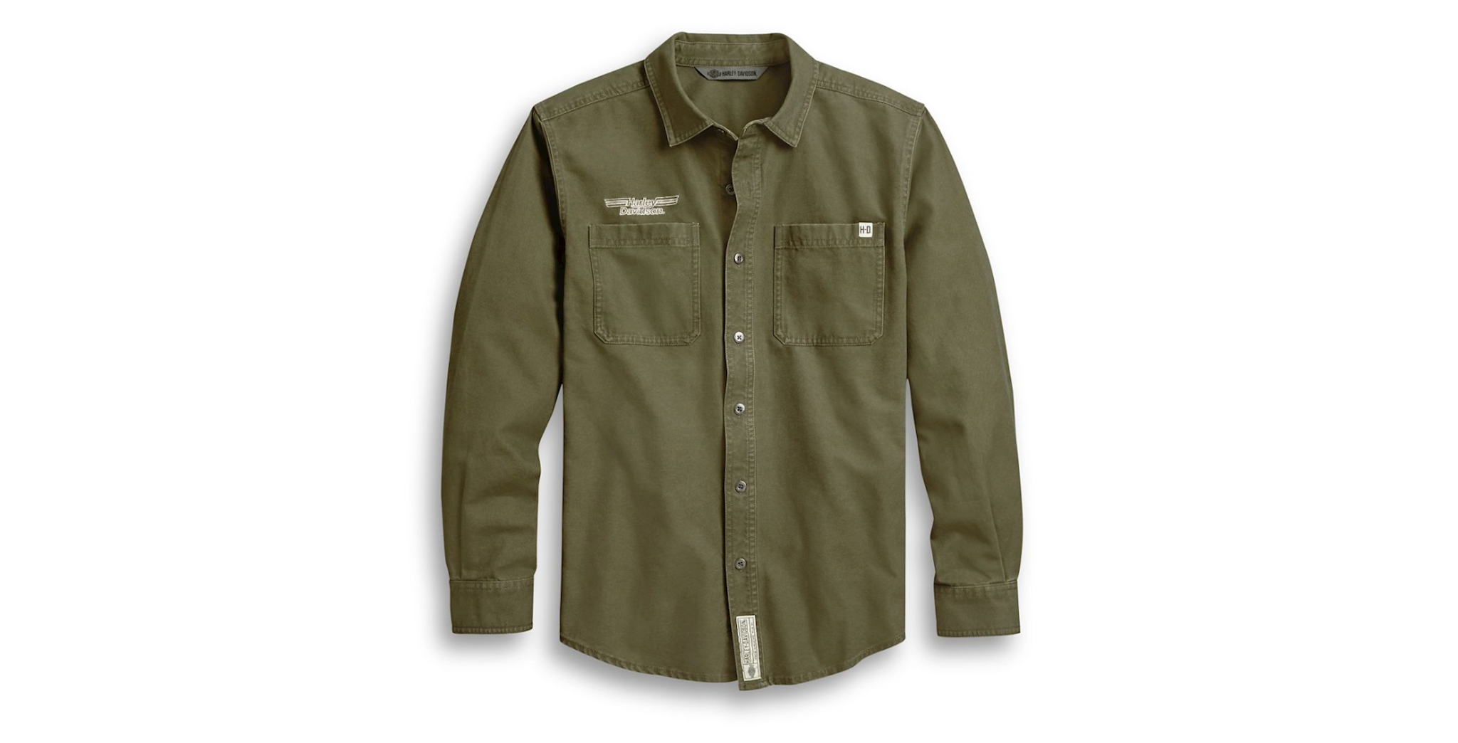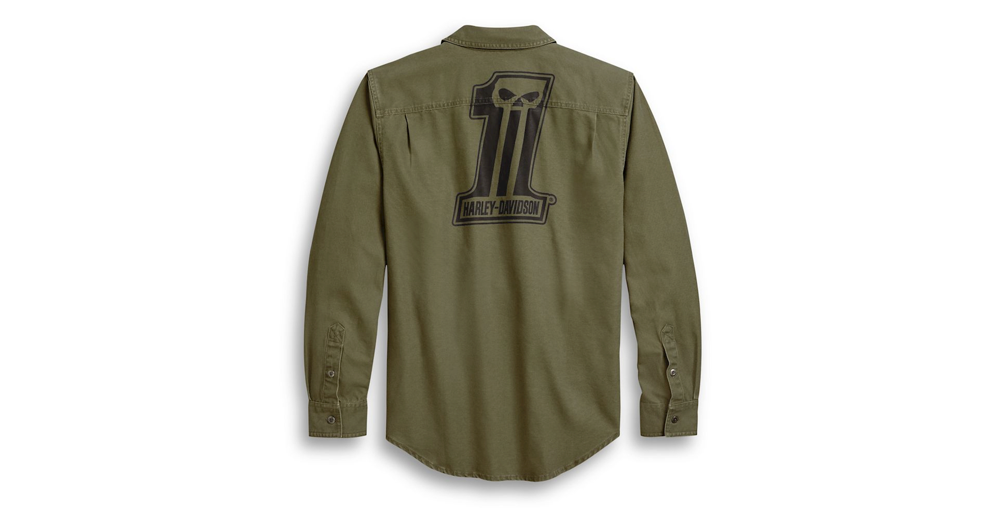 The versatile #1 Skull Slim Fit Shirt works on two levels. Cut from heavyweight cotton canvas, try it layered as a lightweight shirt jacket over a tee or tank. Or go the traditional way and sport this men's long sleeve shirt buttoned up with jeans or worn khakis. For an old-school feel, AMF tank graphics mark the left chest while the back features an oversized print of our #1 skull. Materials: 100% cotton canvas is washed for softness. Rider-Friendly Features: Snap-down collar. Closure: Button front and cuffs. Pockets: Chest pockets. Graphics: Embroidered graphics. Woven labels. Printed graphics. Fit: Slim Fit—fits closer to the body.