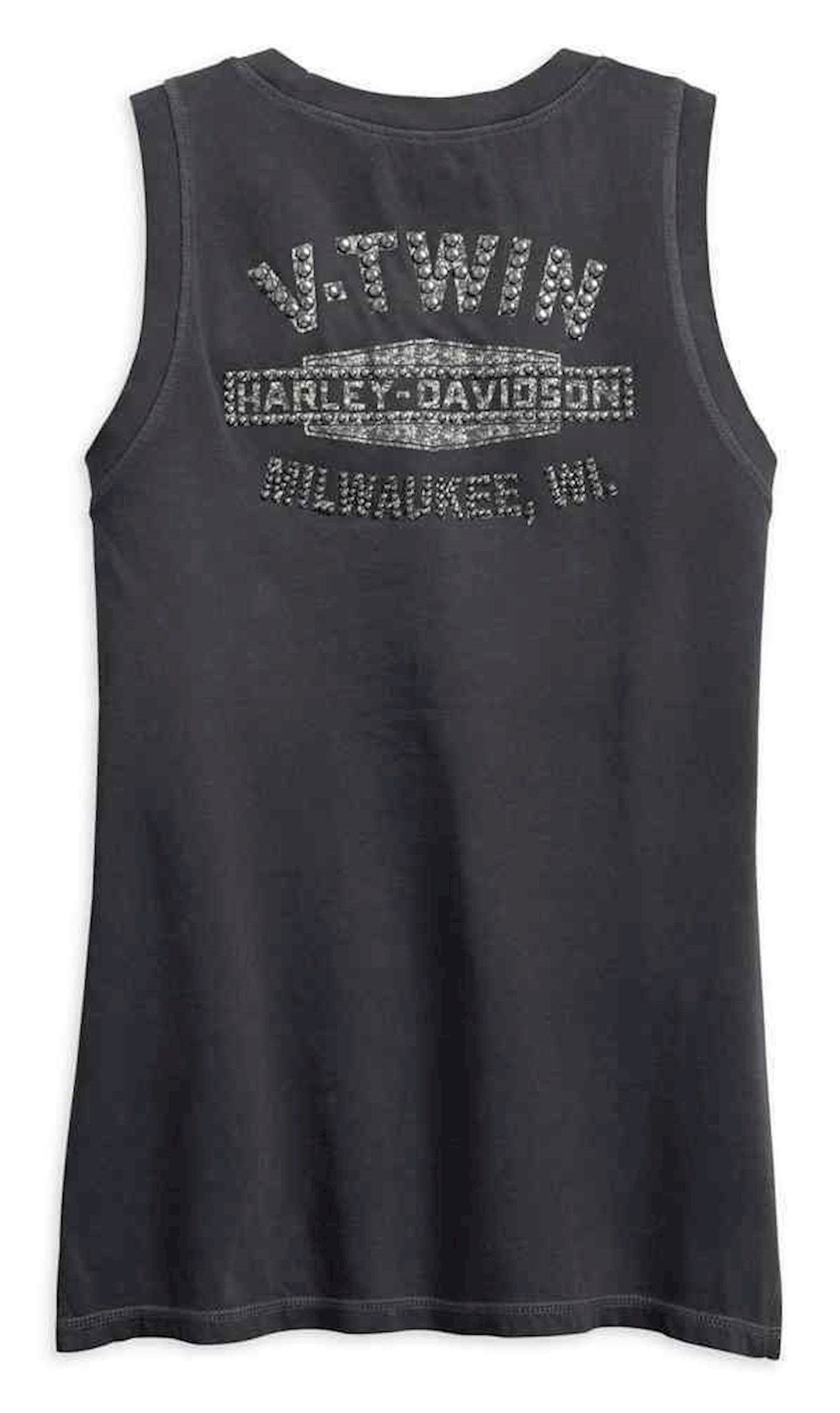 Harley-Davidson® Women's Studded V-Twin Muscle Tee, 96296-18VW. Made from 100% cotton jersey with pigment dye is washed for softness. Rib-knit trim. Distressed printed graphics on front. Printed graphics with stud embellishment on back.