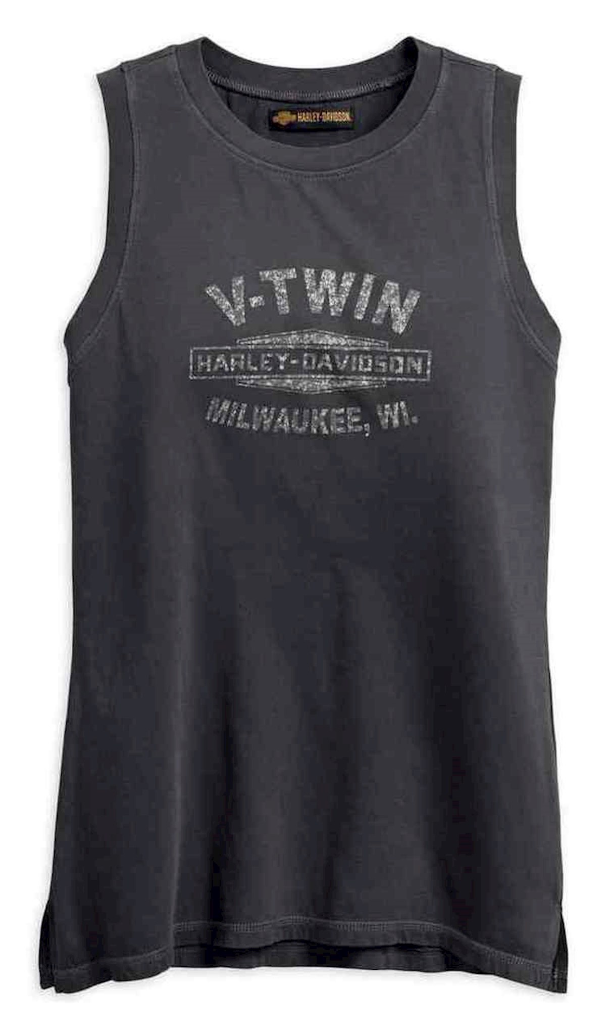 Harley-Davidson® Women's Studded V-Twin Muscle Tee, 96296-18VW. Made from 100% cotton jersey with pigment dye is washed for softness. Rib-knit trim. Distressed printed graphics on front. Printed graphics with stud embellishment on back.