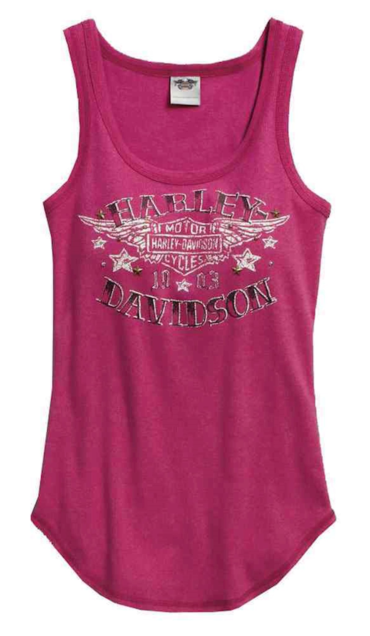 Harley-Davidson® Women's Distressed Print Sleeveless Tank Top, 96315-16VW. Made of 95% cotton and 5% spandex. 2x2 rib. Classic scoop neck. Raw-edge rounded shirttail hem. Printed graphics with stud and star embellishment on front.