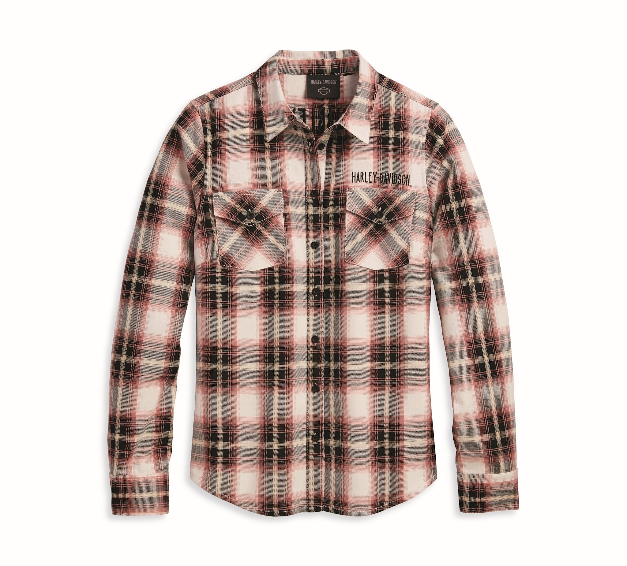 Floral + freedom + flannel...opgeteld maximum comfort en stijl met deze twill plaid van geborsteld katoen. Ons Retro Winged Flannel Shirt heeft een knoopsluiting aan de voorkant en manchetten, stevige borstzakken en een klikkraag die niet flappert als je op het zadel zit. De geborduurde graphics smelten vrijheid, rozenaccenten en onze iconische branding samen tot een kenmerkende vintage Harley-Davidson look.