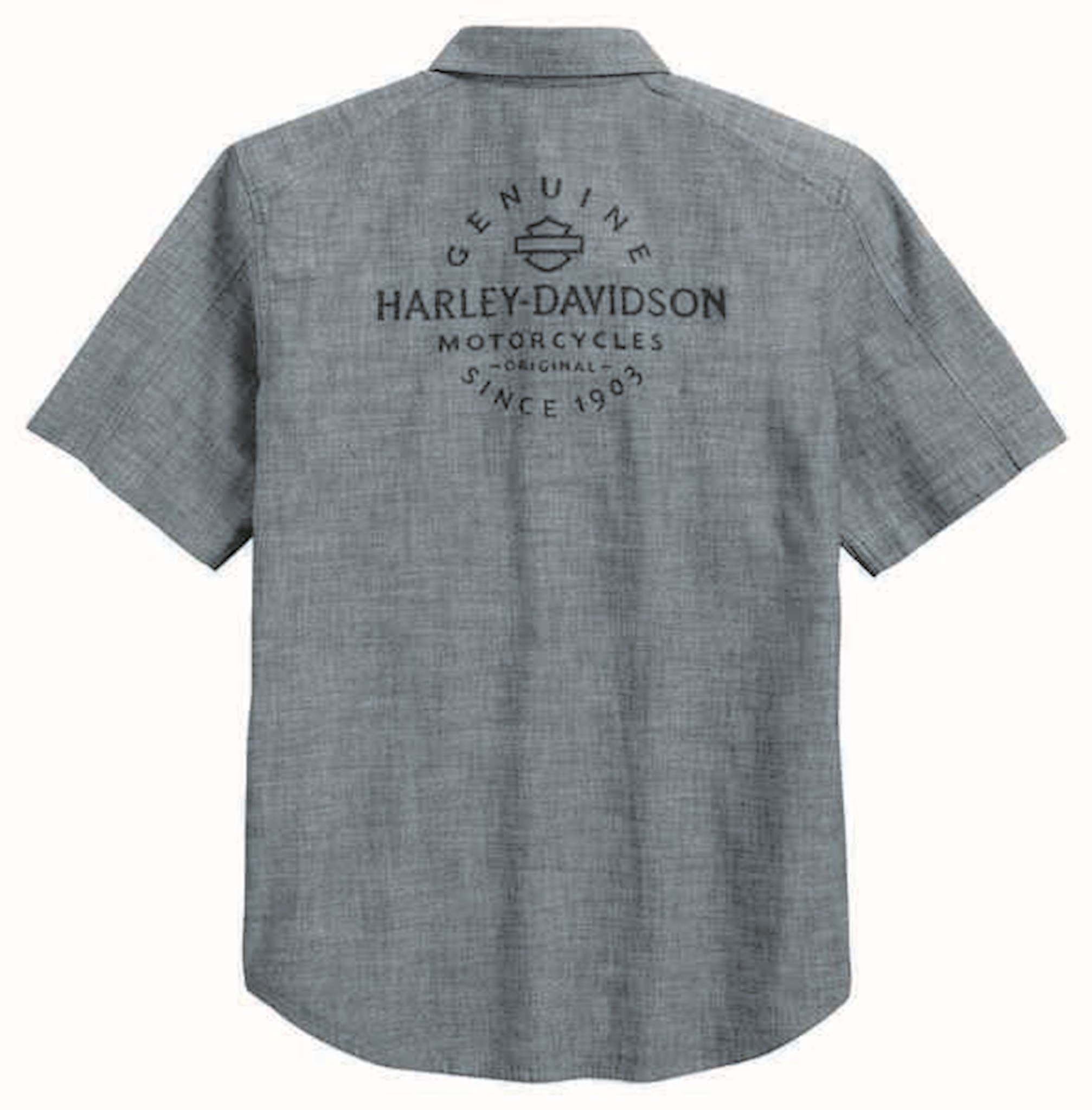 Harley-Davidson® Men's Textured Canvas Short Sleeve Shirt, 96600-17VM. Made of 100% cotton oxford slub, washed for softness. Features button front, and snap-down collar. Two button flap chest pockets and one chest pocket with hook-and loop closure. Printed graphics on right chest, left chest pocket, and back.