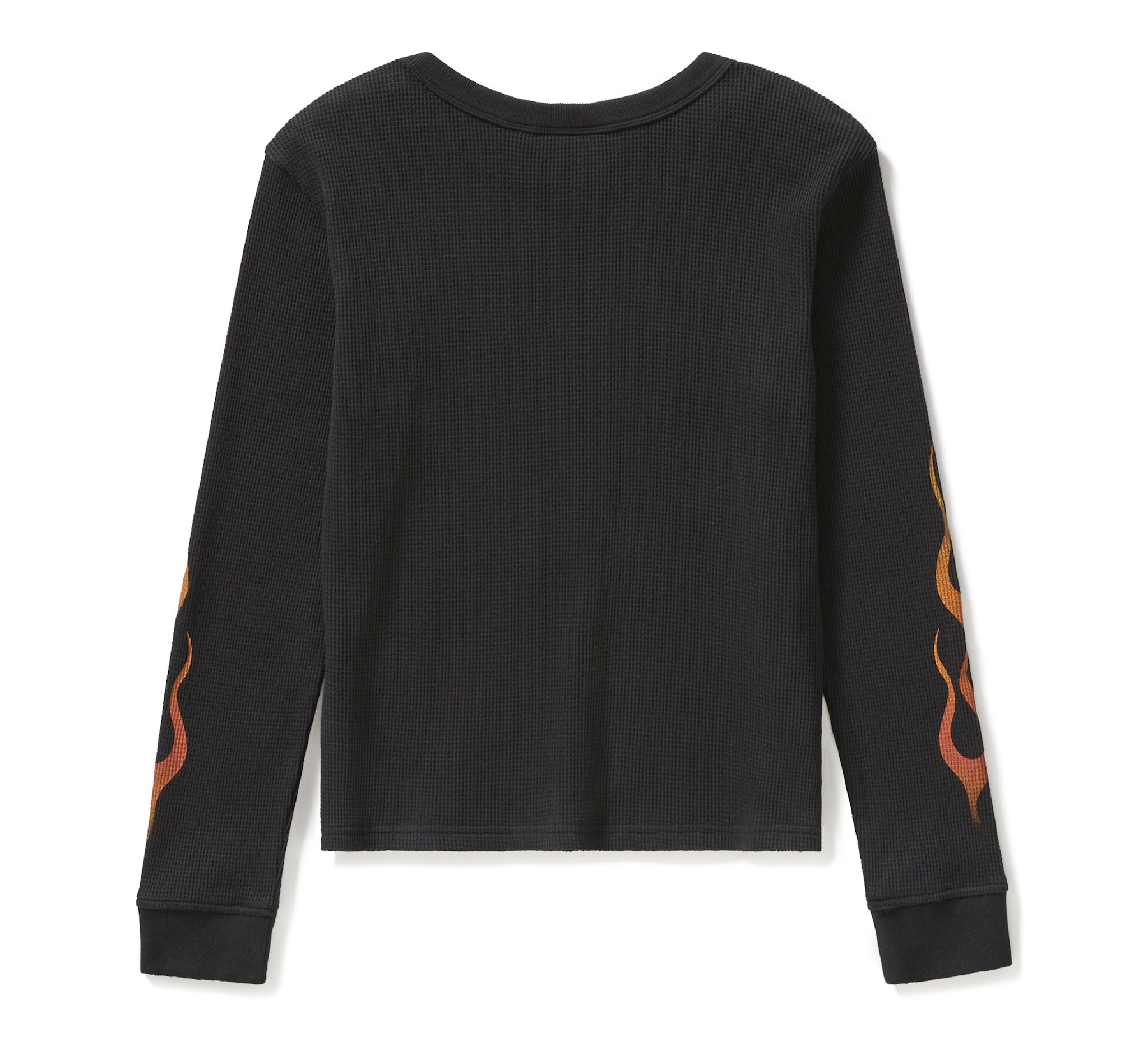 oeg een laagje vurige H-D-stijl aan je garderobe toe met onze Vintage Flames Knit Top. Hij is gemaakt van een thermische mix van katoen en polyester die met enzymen en wasverzachter is gewassen voor een versleten look en feel. Deze longsleeve crew neck os afgewerkt met gradiënt flame graphics op de voorkant en de mouwen.