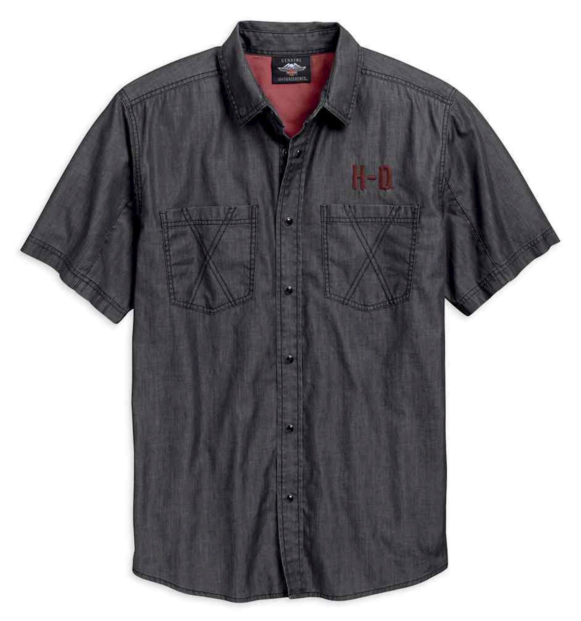 Harley-Davidson® Men's Washed Short Sleeve Woven Shirt, 96764-19VM. Made from 100% cotton chambray is enzyme washed for softness. Snap-down collar. Snap front. Chest pockets. Stitching on pockets. Contrasting inner back yoke lining. Embroidered graphics.