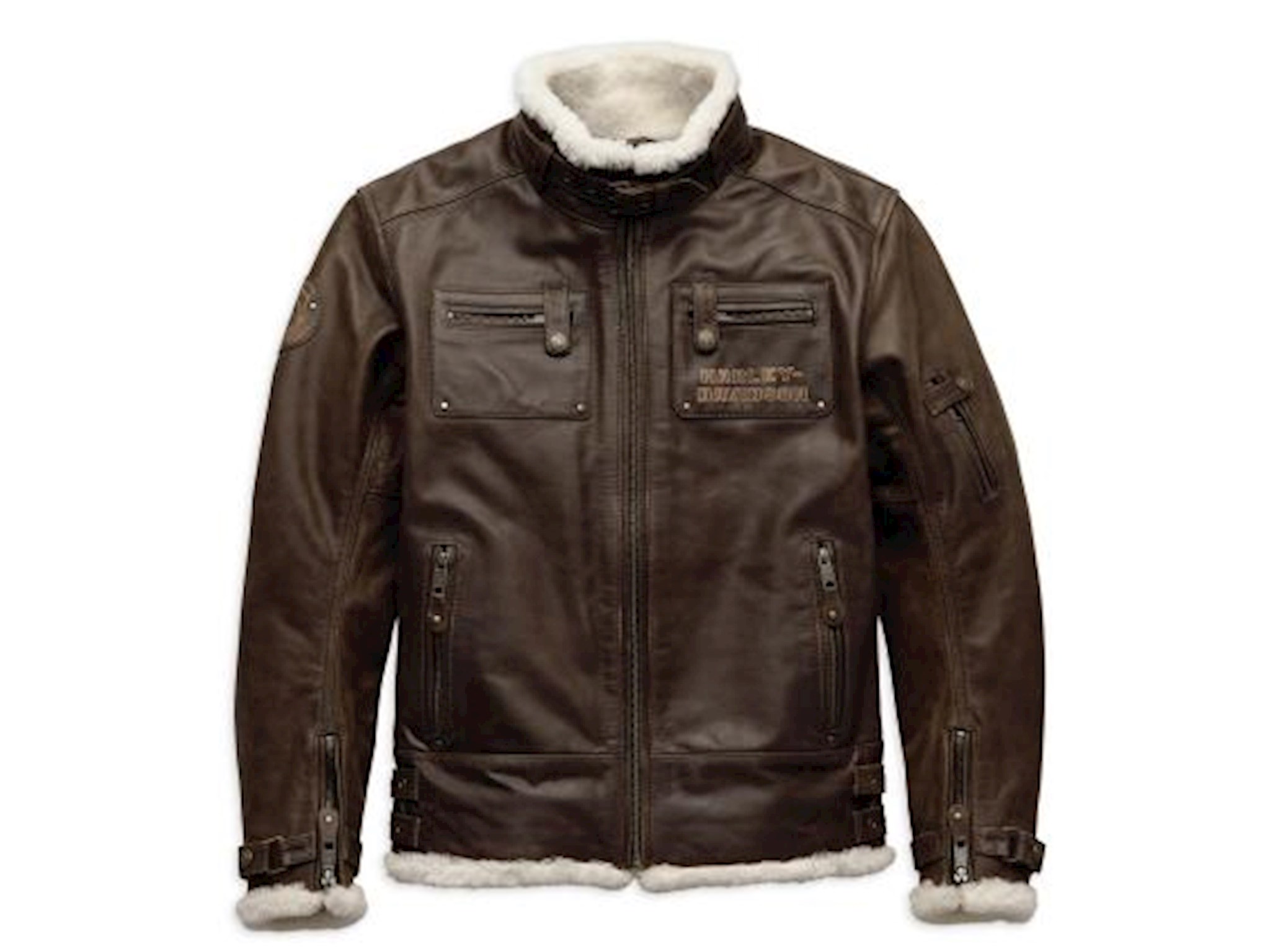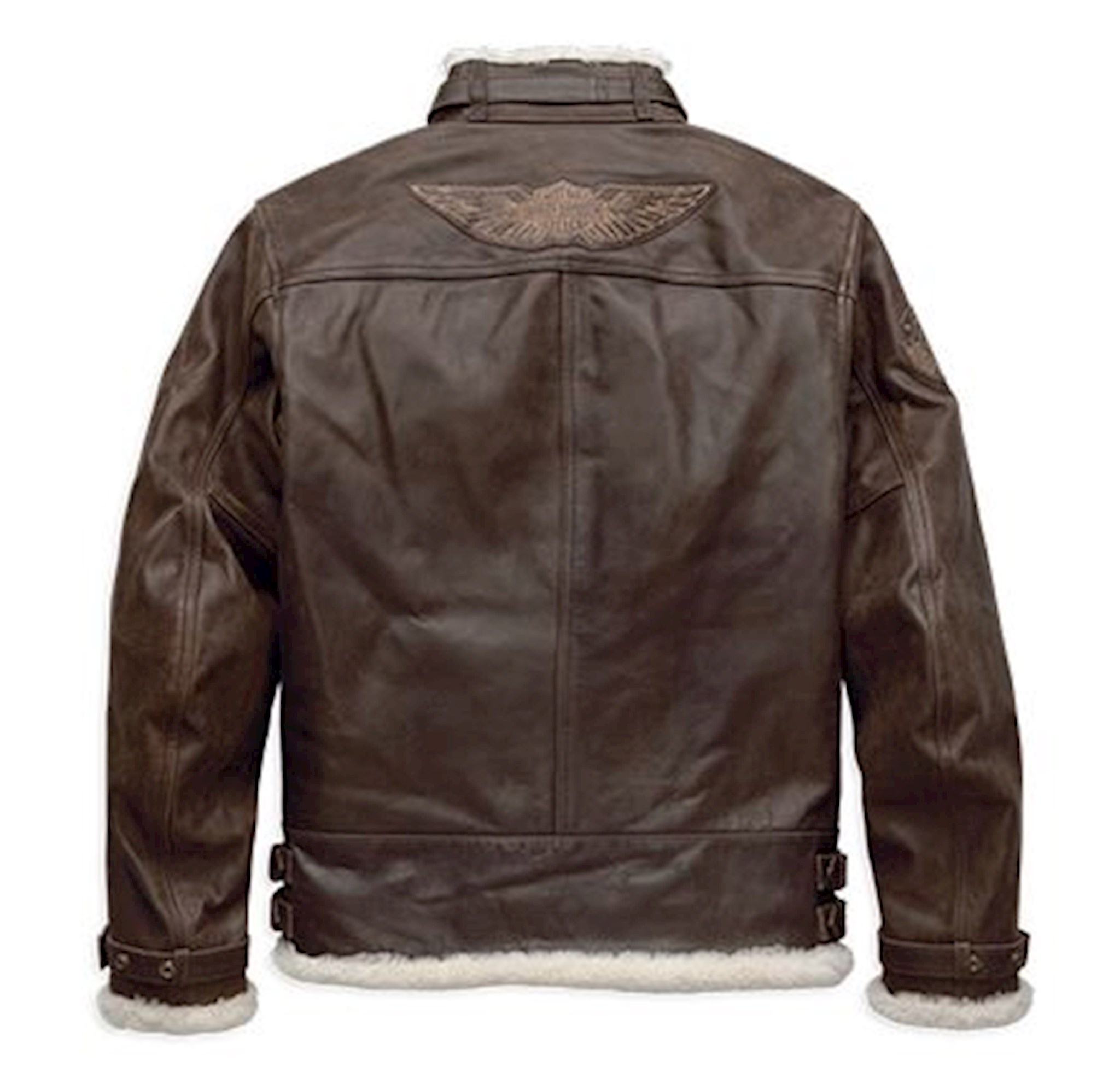 Removable polyester taffeta zip-out full-sleeve quilted liner with two stash pockets. Slim Fit - fits closer to the body. Pre-curved sleeves. Double buckle waist tabs. EN 1621-1 CE-approved removable body armor at elbows and shoulders. Back body armor pocket fits CE Level 1 Back Armor (98150-17VR, sold separately). Mock neck collar with buckle tab. Zipper cuffs with snap tabs. Zipper hand-warmer pockets. Zipper chest pockets with snap tabs. Zipper stash pocket with snap tab on sleeve. Two interior stash pockets and one interior zipper pocket. Laser-etched graphics, leather patch with studs, and leather appliqué graphics. Midweight buffalo leather. Polyester mesh lining. Genuine sherpa trim. Certifications: Meets or exceeds CE requirements in abrasion resistance, impact testing, and seam bursting for personal protective clothing. SIZING IS VERY CLOSE FITTING - PLEASE CHOOSE ONE SIZE LARGER THAN TRADITIONAL H-D SIZING.