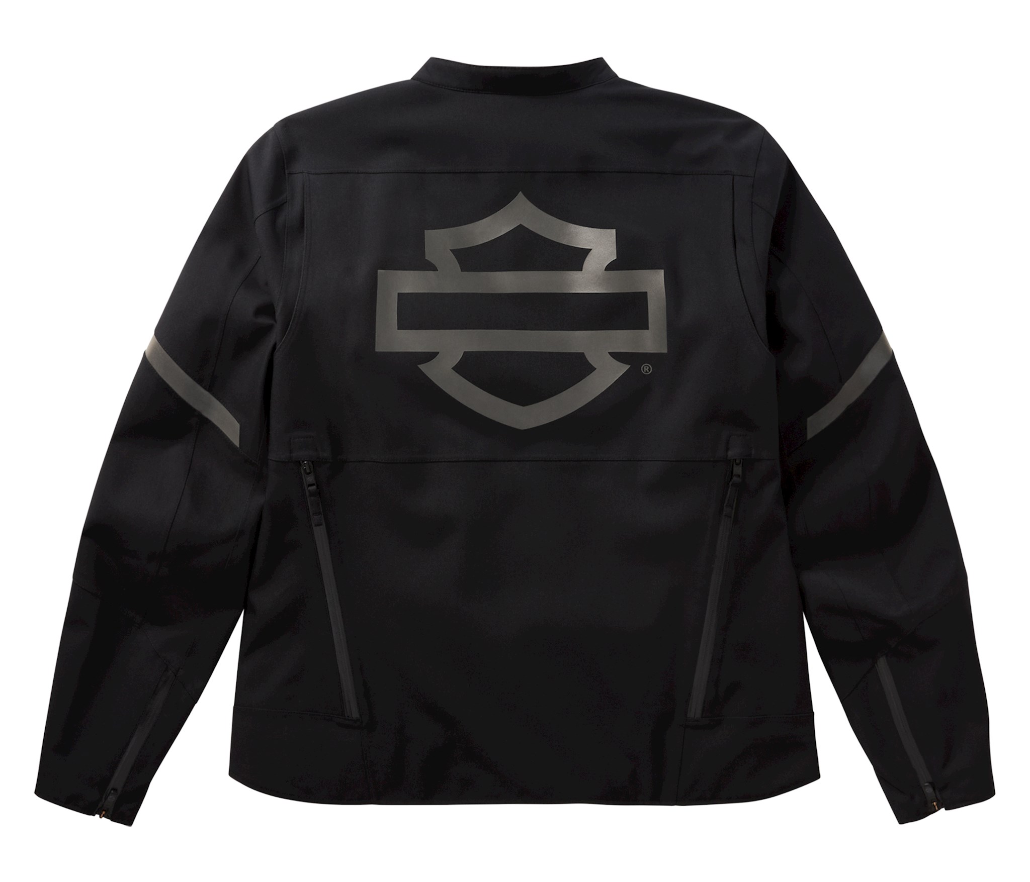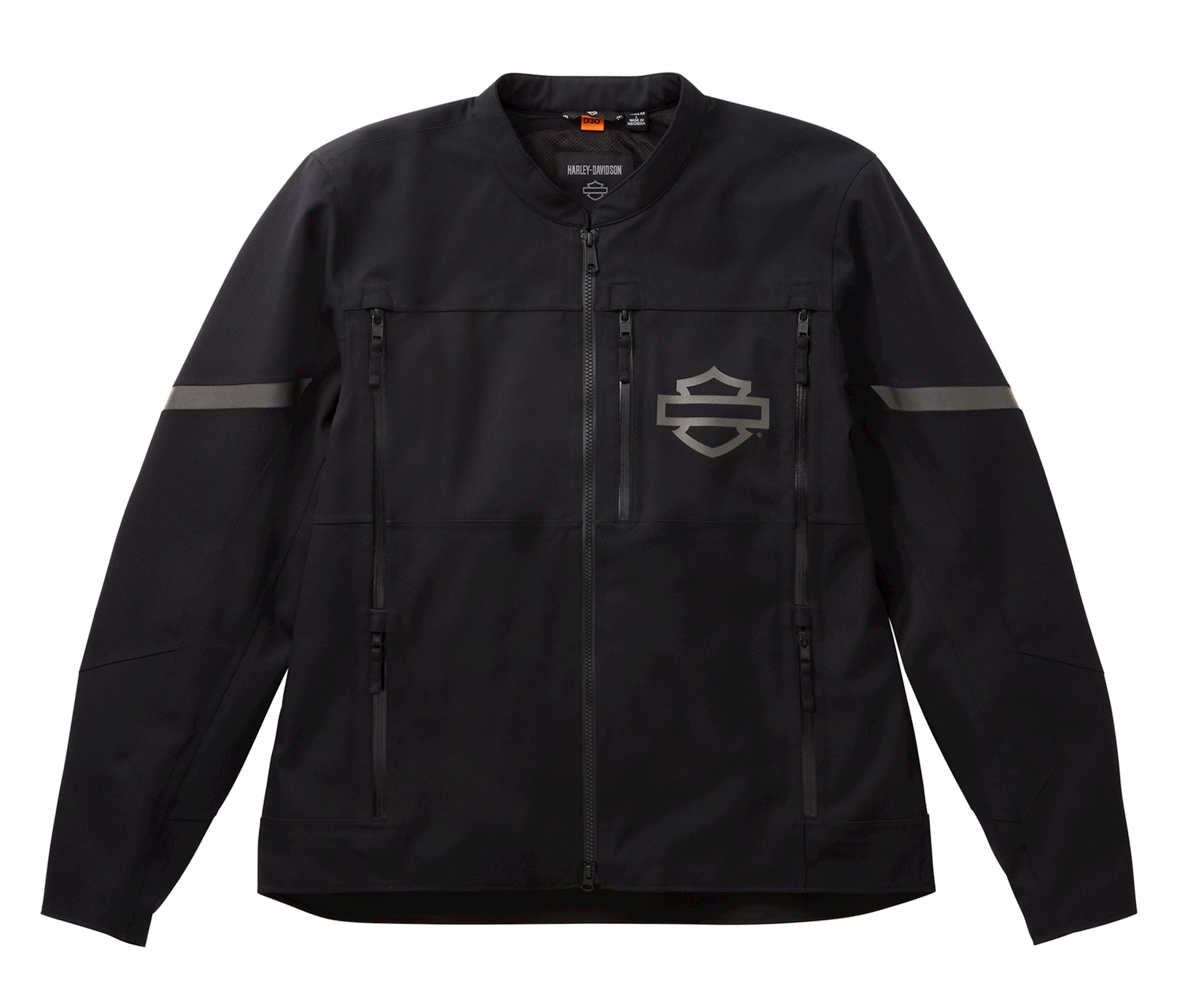 Stay Cool: Zippered chest and back venting for airflow. Stay Warm: Made with windproof materials. Stay Dry: Waterproof and seam sealed. Water-resistant zippers. Fit & Mobility: Action back. Pre-curved sleeves. Materials: 100% polyester heavyweight laminated twill. 100% polyester mesh lining. Closure: Two-way zipper front. Zippered cuffs. Pockets: Zippered hand-warmer pockets. Zippered chest pocket. One interior stash pocket and one interior zipper pocket. Features: H-D® CE-certified PPE is tested and meets abrasion, tear, and seam strength requirements. Includes EN 1621-1 D3O® Ghost armor at shoulders and elbows (98104-22VR & 98103-22VR). Back body armor pocket fits EN 1621-2 certified D3O® Viper Air back body armor (98317-25VR, sold separately). 3M Scotchlite Reflective Material. Design Details: Split mandarin collar. Graphics: Reflective screen print. Certified to EN 17092-4:2020.