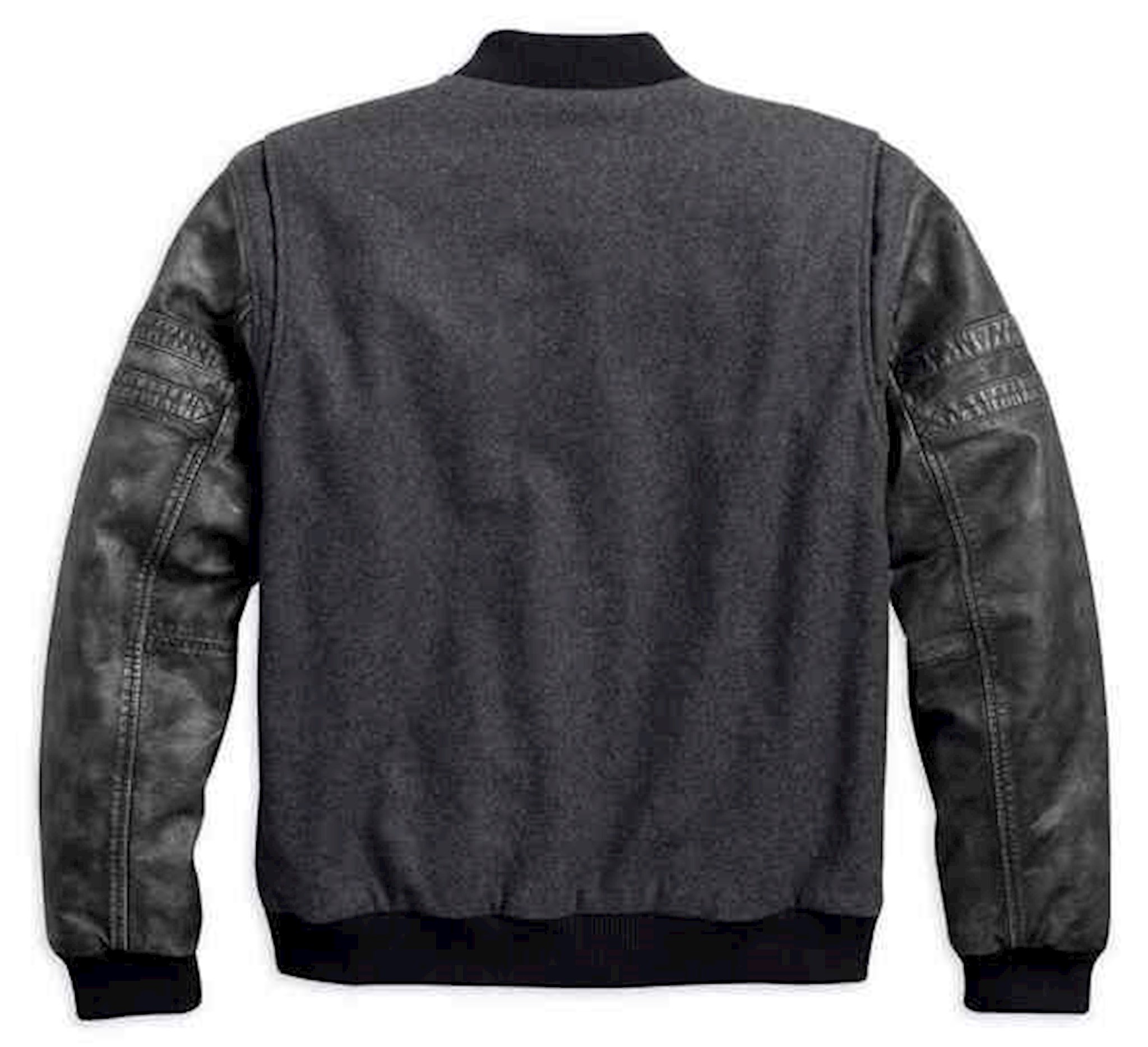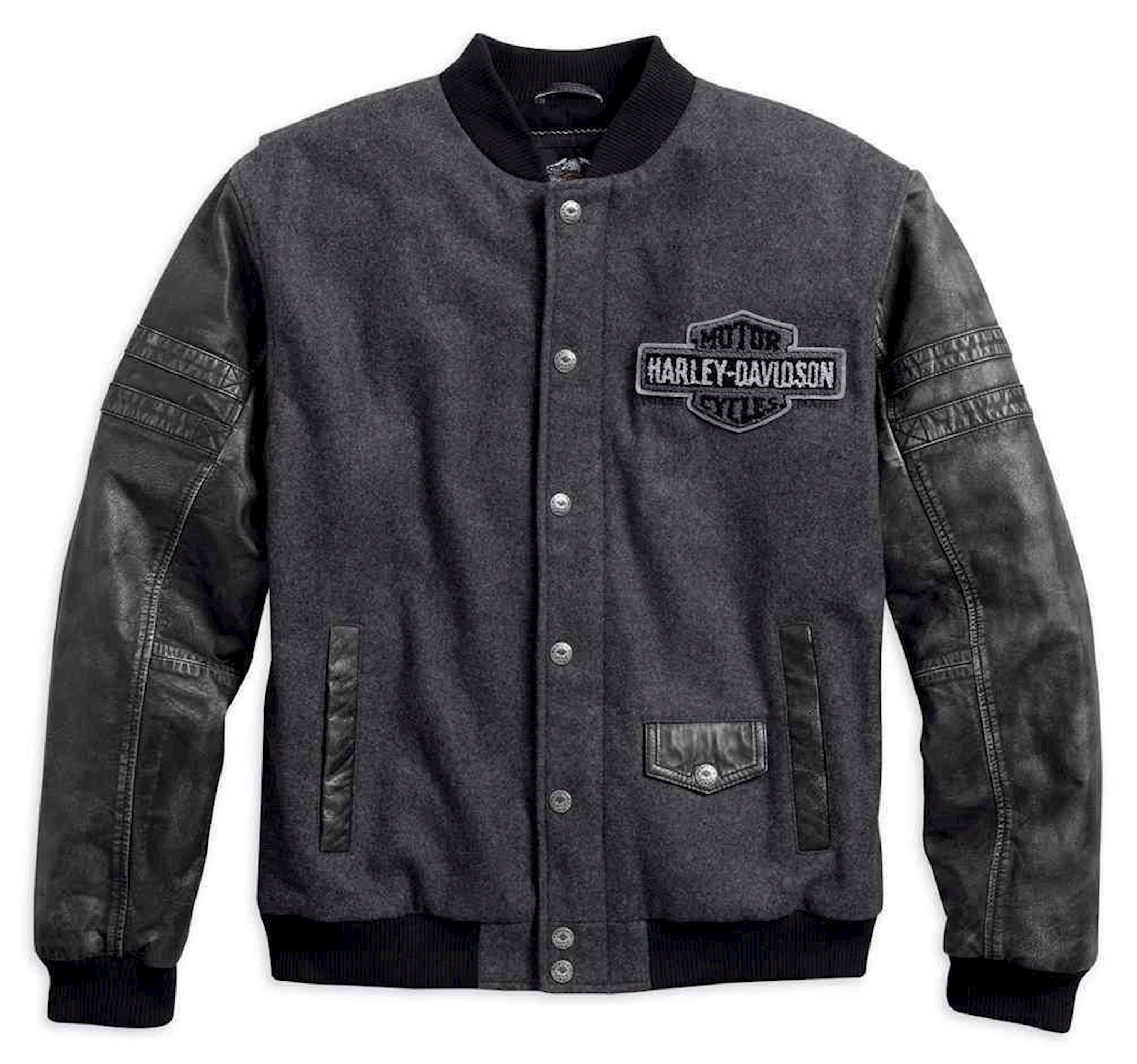 Harley-Davidson® Men's Rowan Casual Varsity Jacket, 97598-17VM. Made of 70% wool and 30% polyester with cotton sheeting body lining and polyester taffeta sleeve lining. Underarm venting grommets. Rib-knit collar, cuffs, and waist. Two-way zipper front with snap placket. Action back. One horizontal interior pocket and one zipper vertical interior pocket with media port. Distressed cowhide leather sleeves and pocket trim for a vintage look. Chenille patch on left chest.