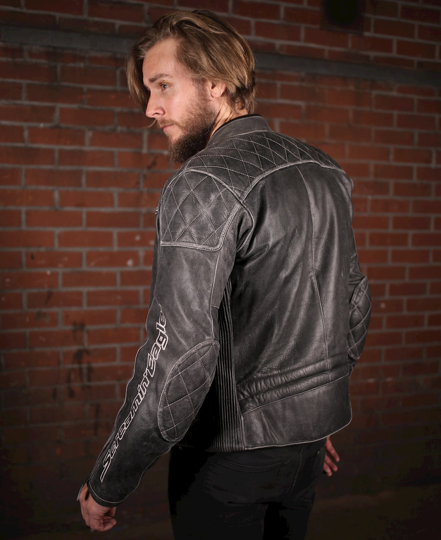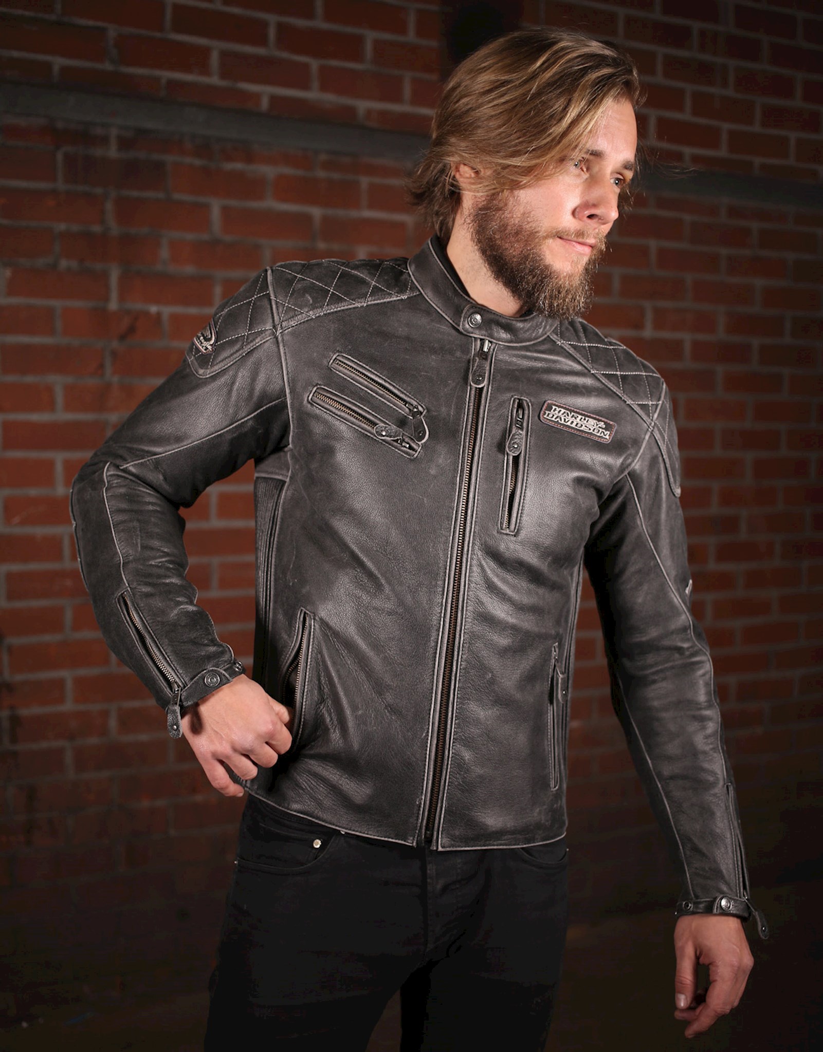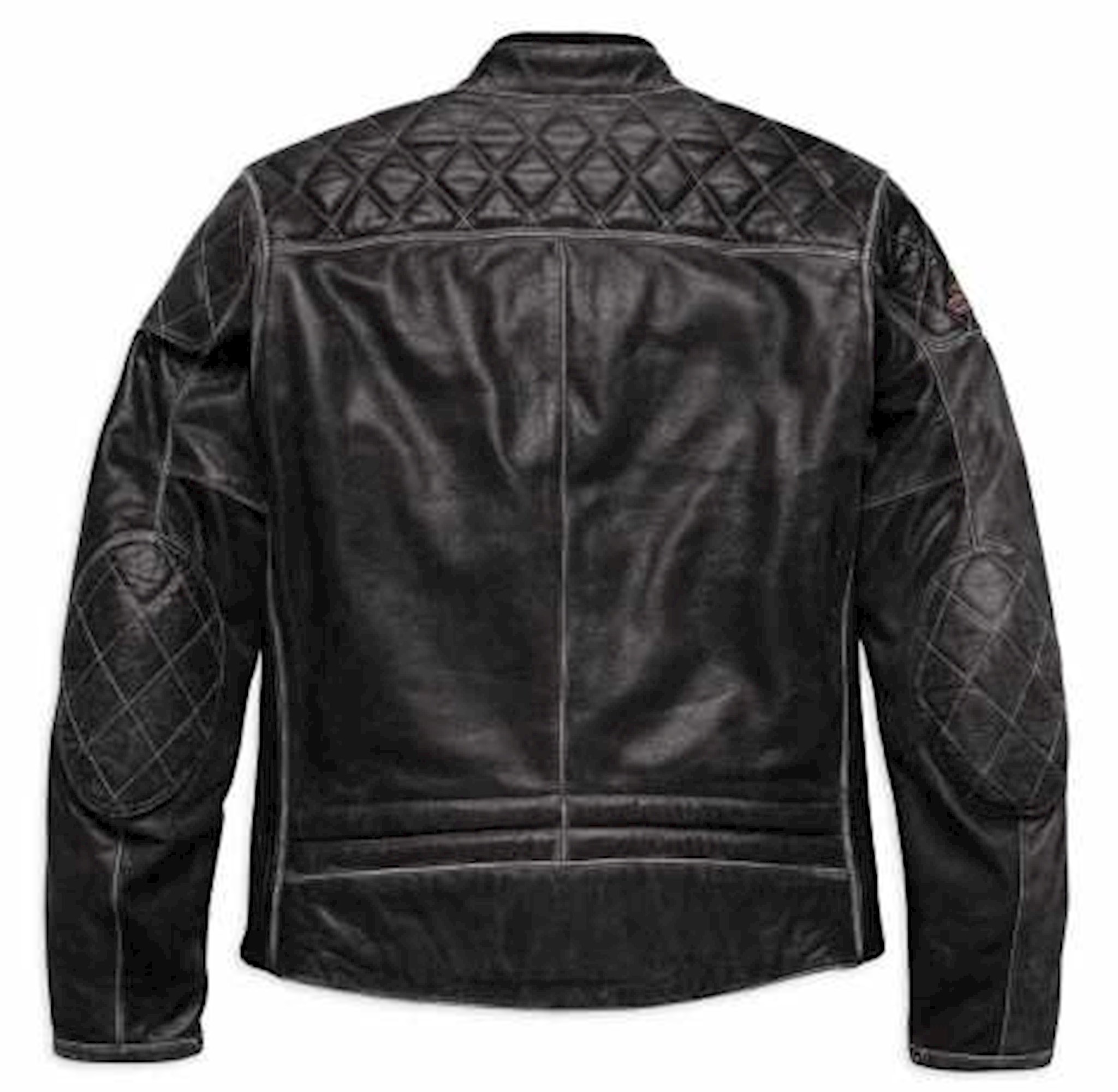 Removable polyester taffeta zip-out full-sleeve quilted liner with two pockets. Pre-curved sleeves. Power-stretch side panels. Slim Fit—fits closer to the body. EN 1621-1 CE-approved removable body armor at elbows and shoulders. Back body armor pocket fits CE Level 1 Back Armor (98150-17VR, sold separately). Zipper front. Zipper cuffs with snap tabs. Zipper hand-warmer and chest pockets. Two interior stash pockets and one interior zipper pocket. Distressed leather for vintage look. Dirty leather patches and embroidered graphics. Heavyweight abrasion-resistant cowhide leather. Polyester mesh lining. Certification: Meets or exceeds CE requirements in abrasion resistance, impact testing, and seam bursting for personal protective clothing. EU 2016/425 certified. SIZING IS VERY CLOSE FITTING - PLEASE CHOOSE ONE SIZE LARGER THAN TRADITIONAL H-D SIZING.
