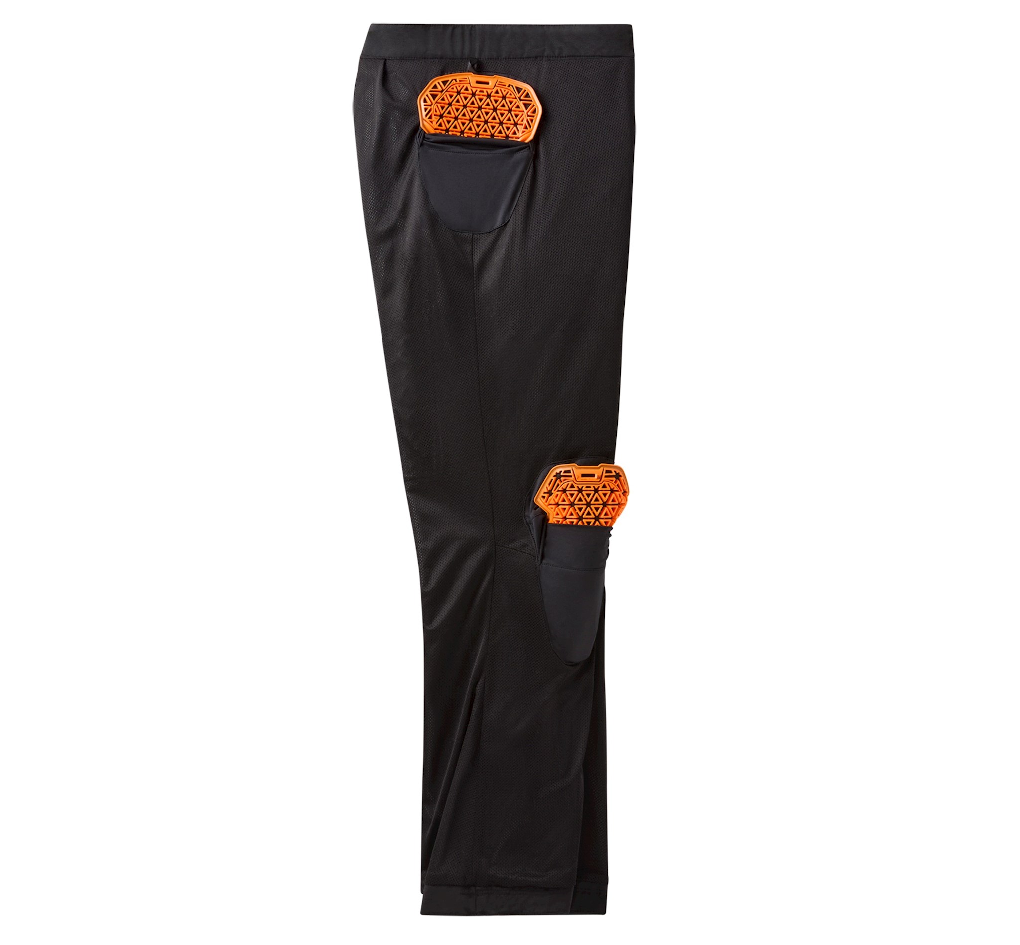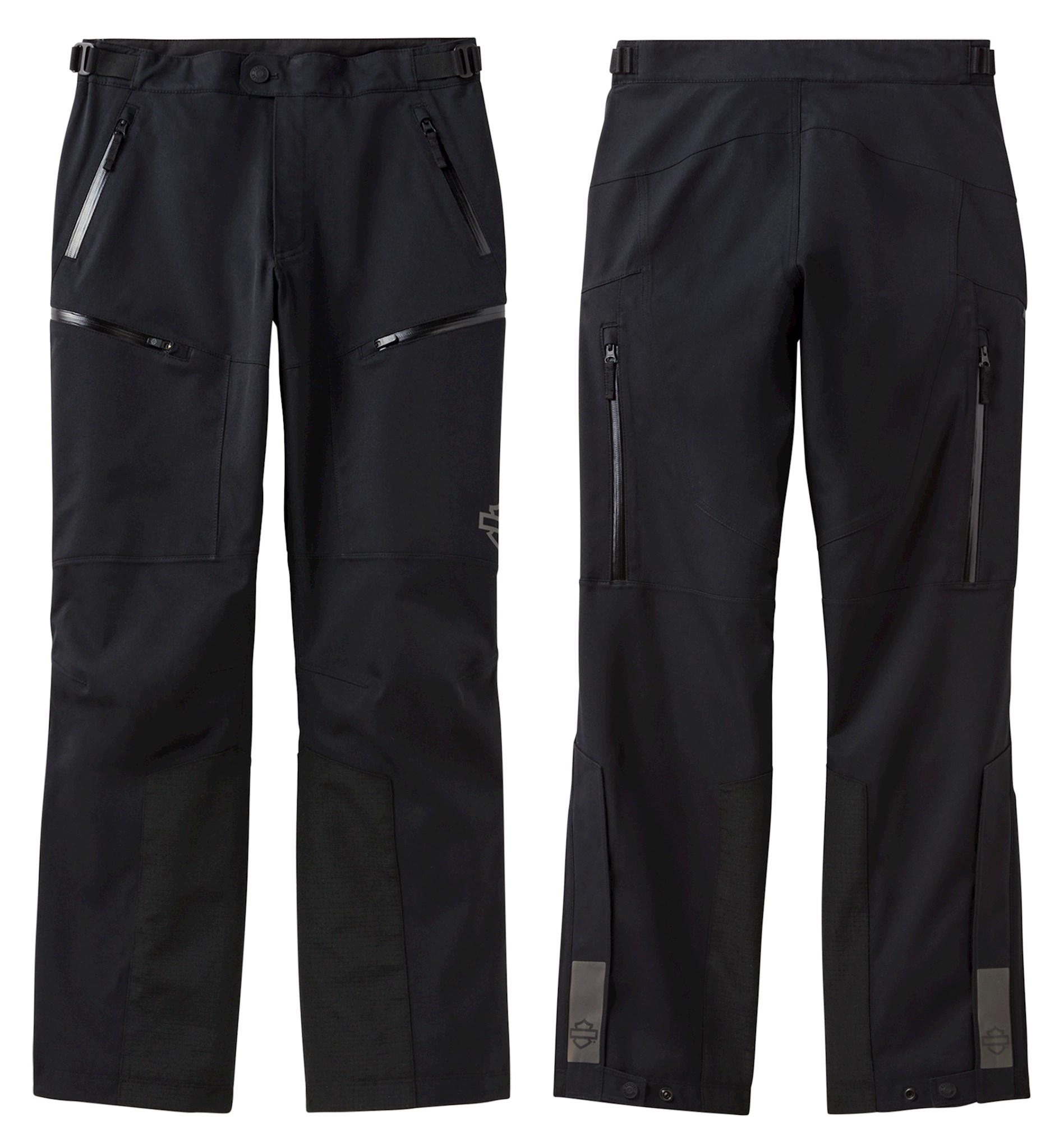 Waterproof and fully seam-sealed. Standard fit with gusseted crotch and lower leg opening. Materials: 100% polyester heavyweight laminated twill. 100% polyester mesh lining. Closure: Zip front fly with button closure. Adjustable ladder lock waistband. Zippered front hand pockets and zippered thigh pockets. Features: H-D® CE-certified PPE is tested and meets abrasion, tear, and seam strength requirements. Includes EN 1621-1 certified D3O® Ghost™ armor at knees. Hip armor pockets fit D3O® Ghost™ hip armor (98104-22VR, sold separately). 3M™ Scotchlite™ Reflective Material. Design Details: Hanger loops. Graphics: Reflective heat transfers and reflective screen print. Certified to EN 17092-4:2020. Inseam: 32".
