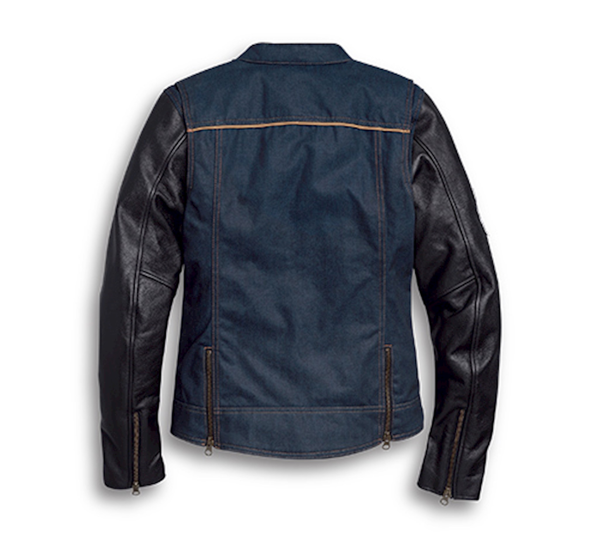Two of our favorite materials hook up for an epic jacket. The Arterial Abrasion-Resistant Slim Fit Denim Riding Jacket features mixed construction for gear that's hardwearing yet anything but typical. The Denim body is hearty Cordura® denim built four times more durable than regular cotton denim. Black leather sleeves complement perfectly. The result is a women's textile and leather motorcycle jacket that looks casual off the bike. Stay Cool: Underarm venting grommets for airflow. Fit & Mobility: Action back. Pre-curved sleeves. Hip release zippers. Ride Enhancing Features: Padded shoulders. Mandarin collar. Two-way zipper front. Zipper cuffs. 3M™ Scotchlite™ Reflective Material piping. Pockets: Zipper hand-warmer pockets and snap flap chest pockets. One interior stash pocket and one interior zipper pocket with media port. Design Details: Embroidered patch. Materials: 85% cotton, 15% nylon 11 oz. coated Cordura® denim is at least four times more durable than cotton denim. Midweight cowhide leather sleeves. Polyester twill body lining and polyester mesh sleeve lining.