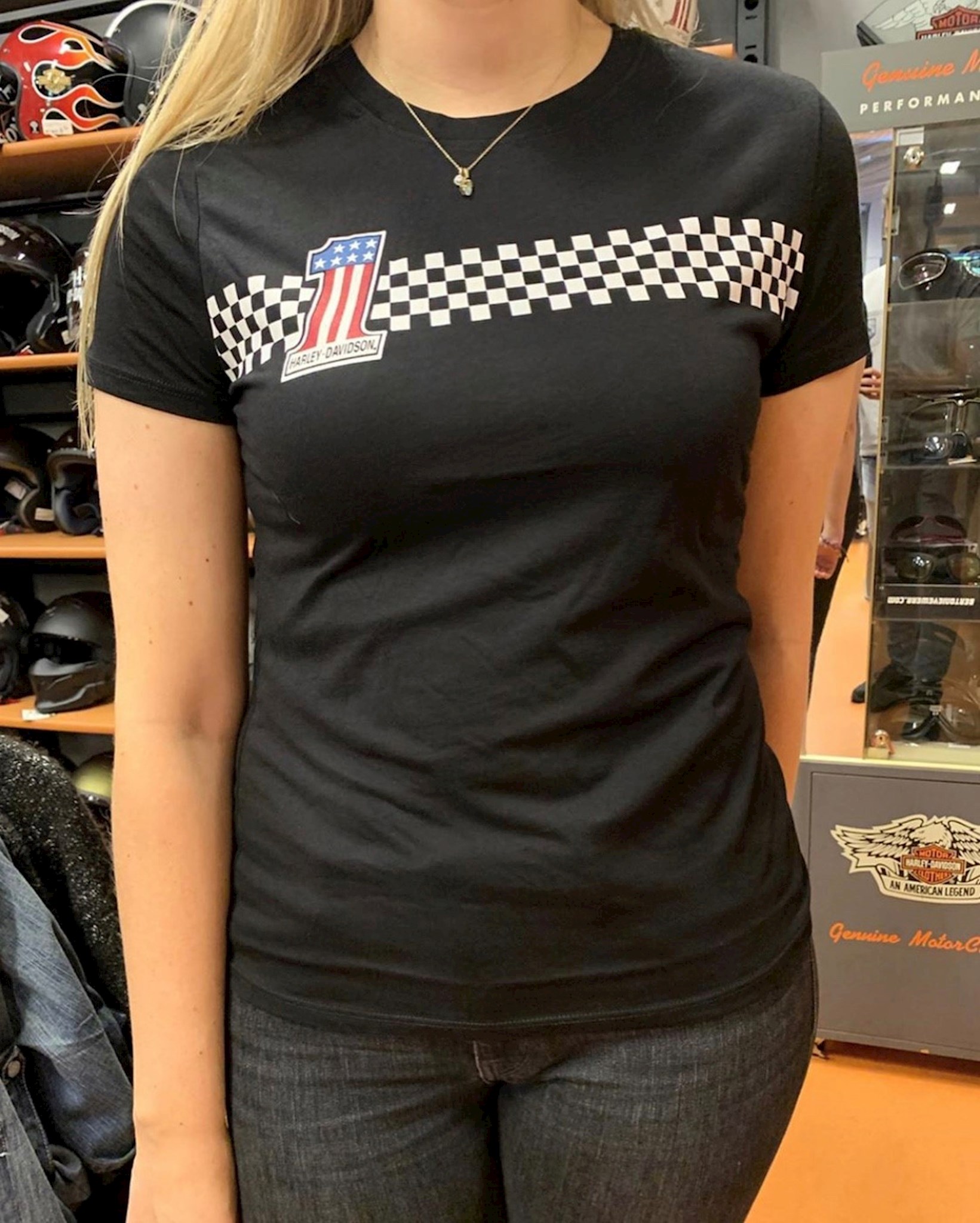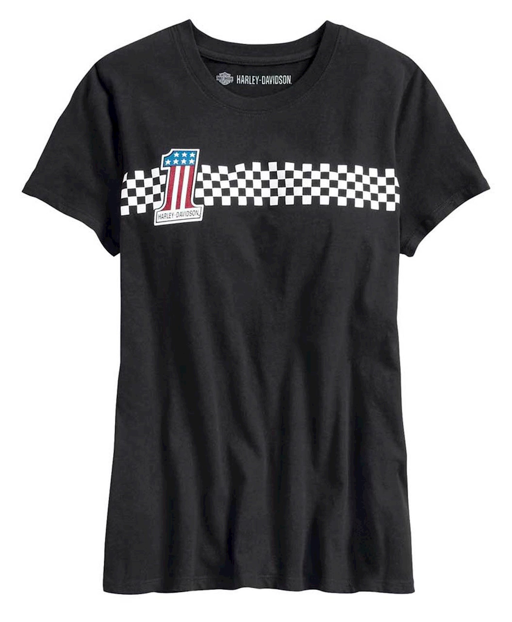 Harley-Davidson® Women’s #1 Checkered Stripe Short Sleeve Tee – Black. Made from 100% cotton jersey. Rib-knit neckline. Printed graphics.