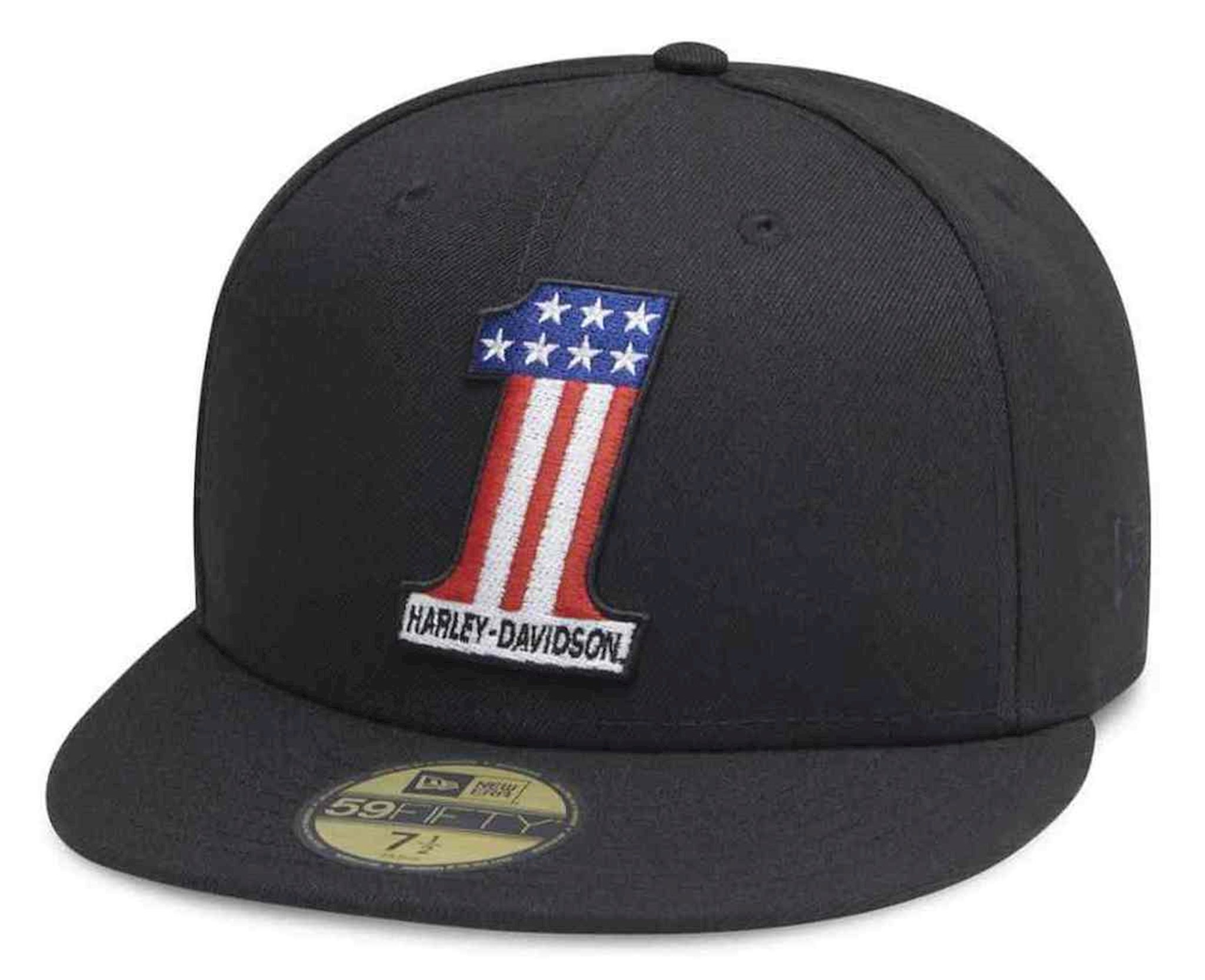Harley-Davidson® Men's #1 Logo 59THIRTY® Baseball Cap, 99418-20VM. Made from 100% polyester. Official 59FIFTY silhouette by New Era with visor sticker for authenticity. Embroidered patch on front. Embroidered graphics on back. Embroidered New Era flag logo on side. Fitted styling.