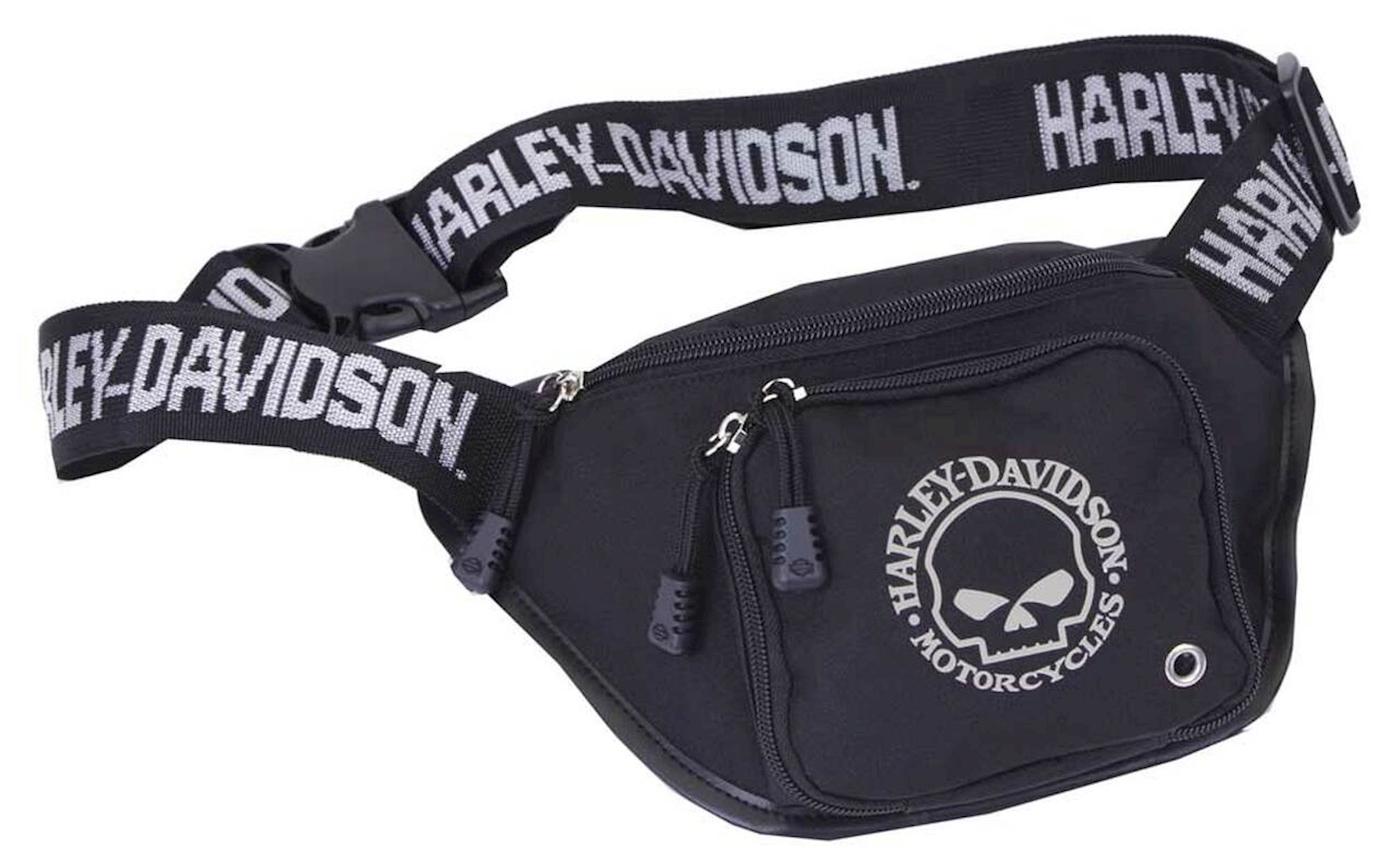 Harley-Davidson® Willie G Skull Logo Belt Bag, 99426-SKULL. Take Willie G’s skull with you when you wear this fanny pack. You are identified as a Harley® fan coming or going, with Harley-Davidson® lettering on the web belt, and Willie G’s skull logo on the pack itself. The pack is made with strong water-resistant polyester. The zippers are self-healing and have logo pull cords and tabs. The belt is adjustable with a Fastex® slip-lock closure. There are two storage compartments, and the front compartment has an air grommet to keep things fresh. The bag measures 10 x 7.5-inches. Made by Athalon® a trusted member of Harley-Davidson’s® family of licensees. Based in Denver, Colorado, Athalon Sportgear is the exclusive manufacturer of Harley’s line of luggage, totes, and other travel accessories. If it’s Harley® Athalon®, it’s the best money can buy.