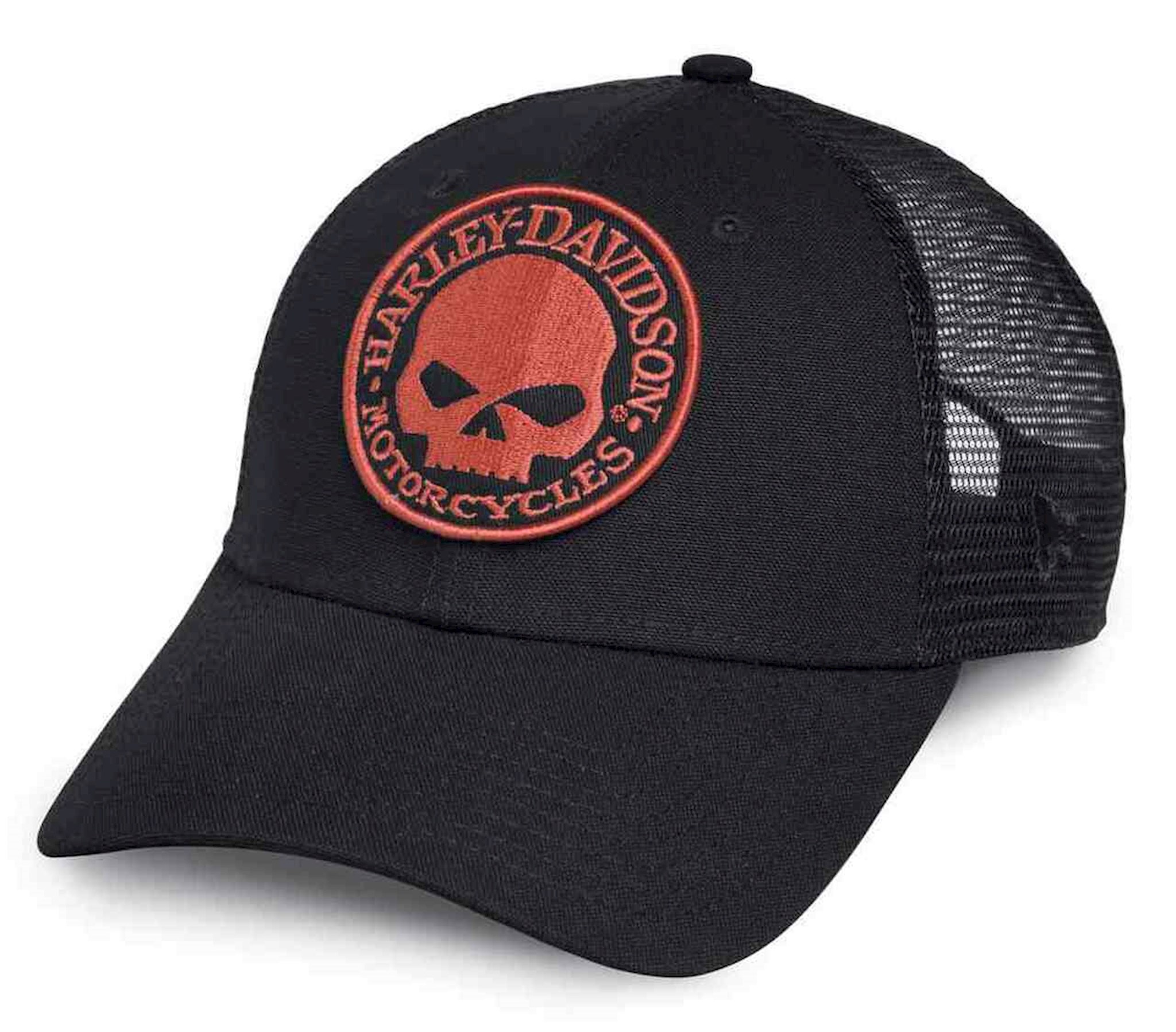 Harley-Davidson® Men's Orange Willie G Skull Trucker Cap, 99491-17VM. Made of 100% polyester with mesh back. Embroidered patch on front. Adjustable snap back closure.