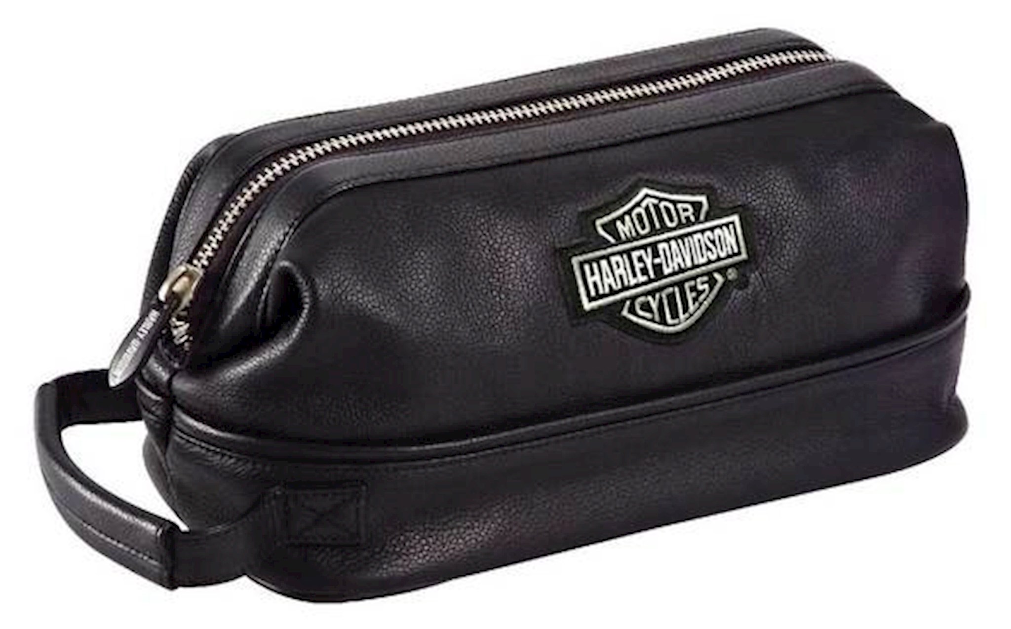 Harley-Davidson® 11-Inch Black Leather Toiletry Dopp Kit, 99609. A leather goods designer named Charles Doppelt was the first to produce this kind of kit. So it was in the early 1900s, and so it is today, most men have a Dopp kit stored in a bathroom closet or under its sink. For any traveling, it has become indispensable. So, if you have to have one, select a Harley-Davidson® kit. This one is made of deluxe top-grain leather. With a center zipper with pull tab, open it up to find a roomy inside for your shaving items, lotions, toothbrush, etc. The kit also features interior wall pockets for the little things you need, like nail scissors, Q-Tips, or a pill box. One of the inside pockets has a zip closure. Getting back to the bag itself, it opens wide just like a "doctor’s bag," with a reinforced frame. It’s roomy enough for brushes, a shampoo bottle, soap container, etc. The best is saved for last…the interior is lined with a beautiful map print lining. Once you close and zip it up, the kit can be carried with the easy grip leather side handle. Measures 11" x 5.5" x 4.5". Made by Athalon® SportGear, the official licensee for Harley-Davidson® travel bags and luggage.