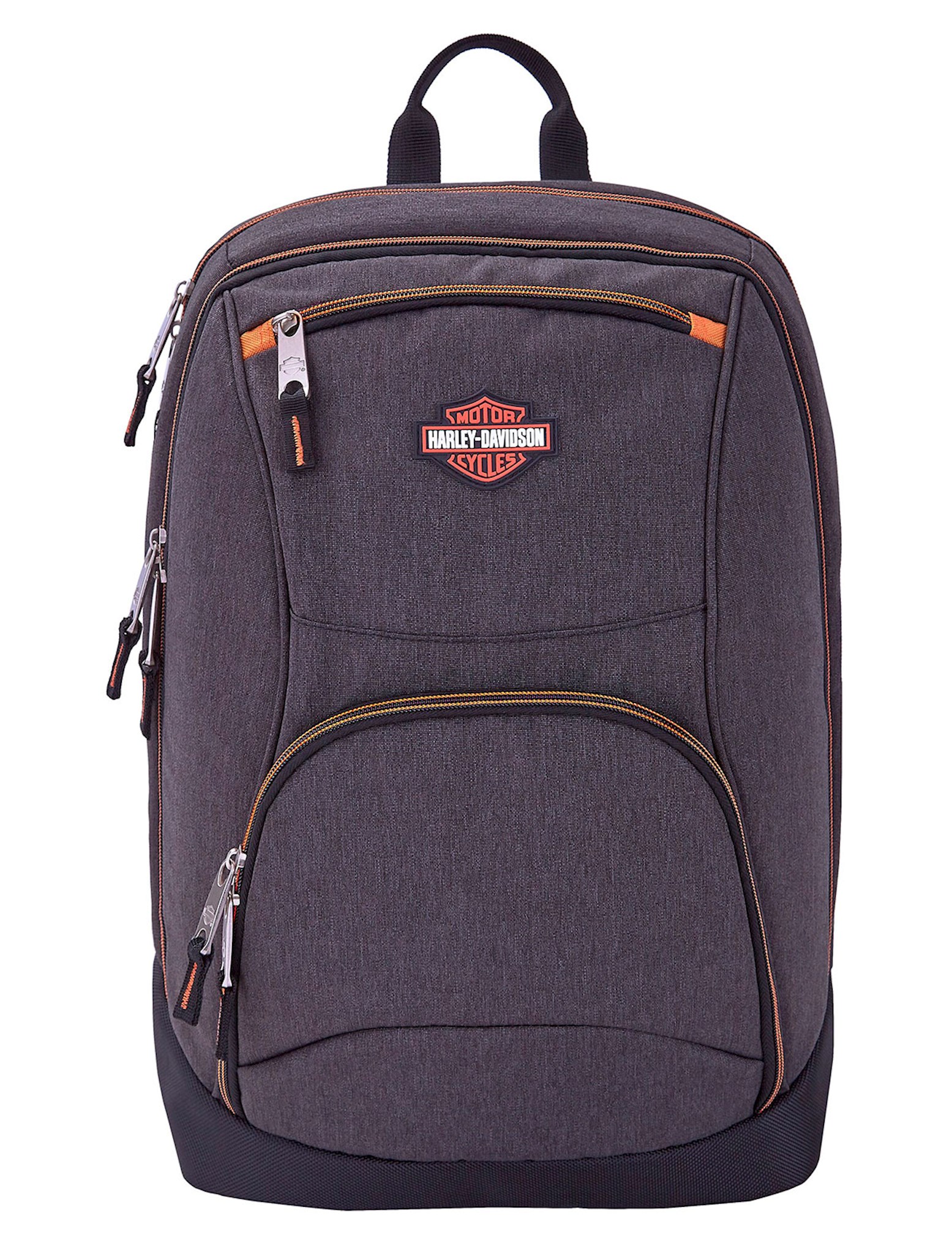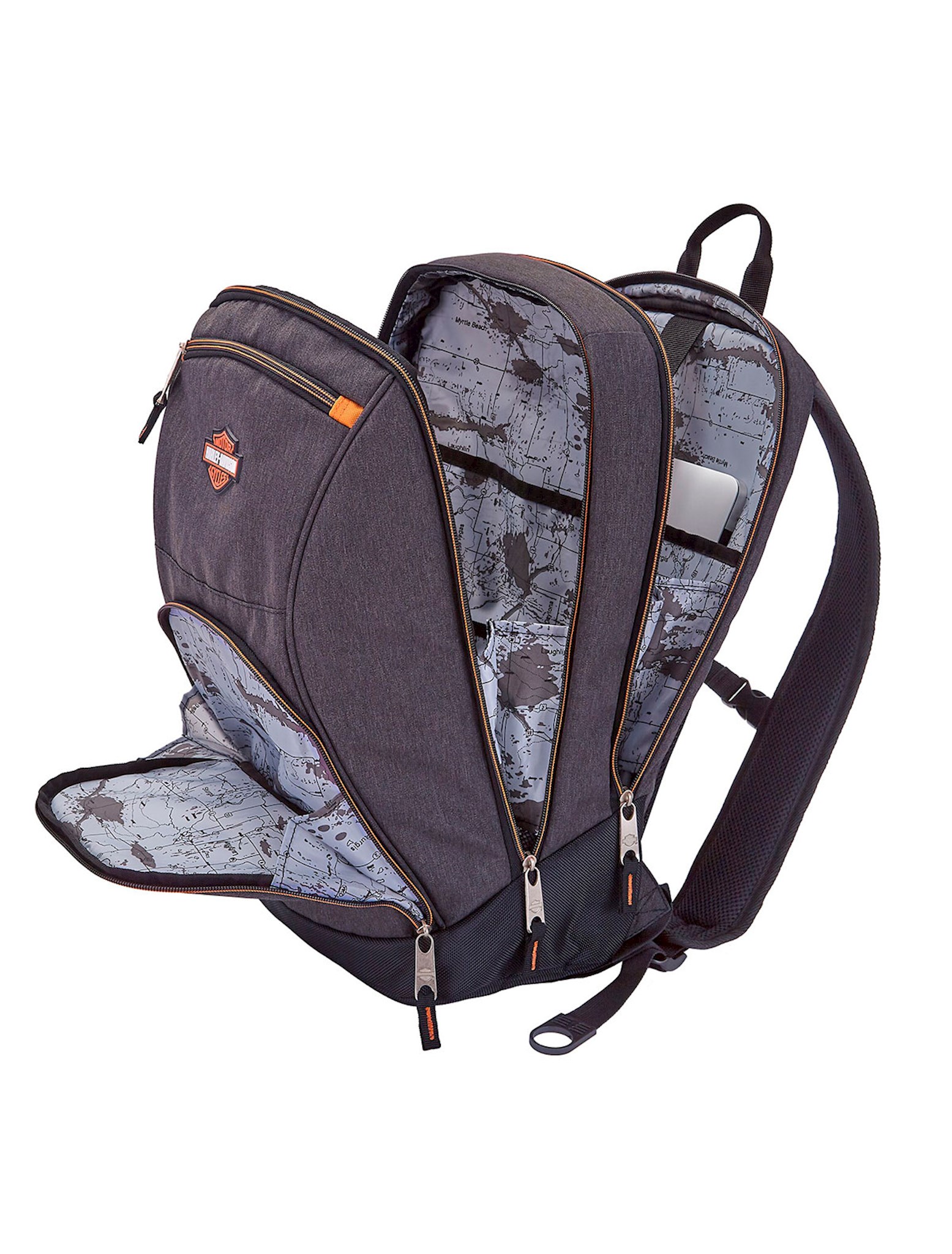 Fabric: Made of rugged, strong, lightweight water-resistant polyester. • Harley-Davidson signature map lining. • Two-tone self-healing nylon zipper. • Deluxe padded backpack with contoured shoulder straps. • Adjustable sternum strap. • Section I: Extra padded for laptop & business gear. • Section II: Organized with mesh and slit pockets. • Two front zippered pockets.