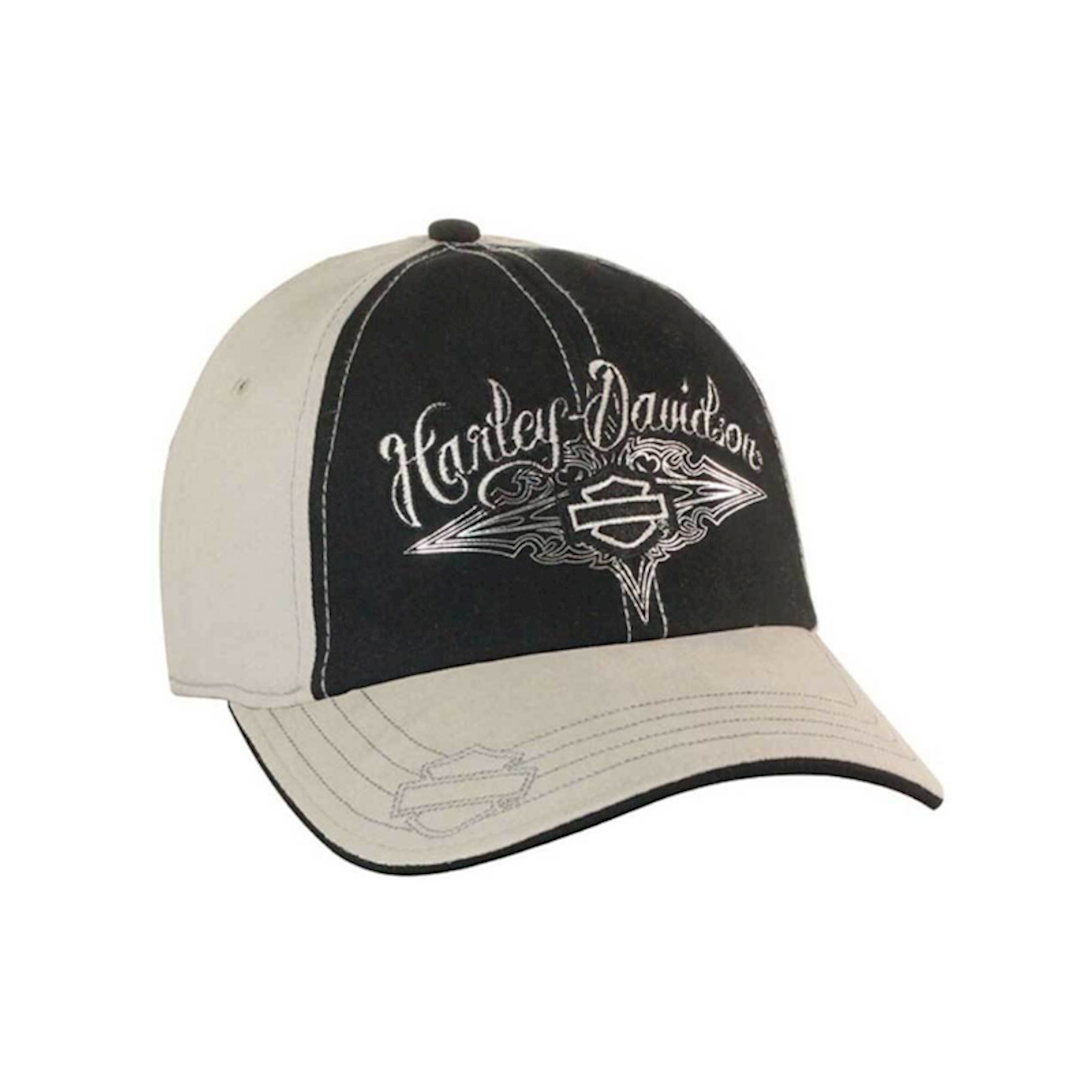 Harley-Davidson® Women's Lustrous Baseball Cap. Black and Birch. Made of 97% cotton and 3% spandex. Features embroidered Bar & Shield graphic with H-D script. Stretch fit.