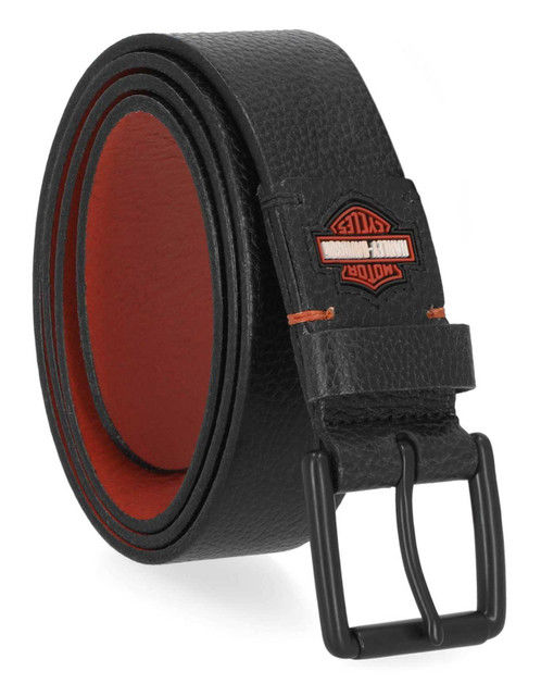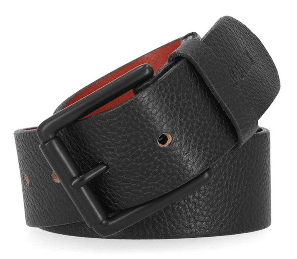 Genuine Harley-Davidson® Men's Belt Constructed from high-quality pebbled leather. Matte Black. Rubber Inlay Bar & Shield Logo. 38mm Wide. Roller Buckle.