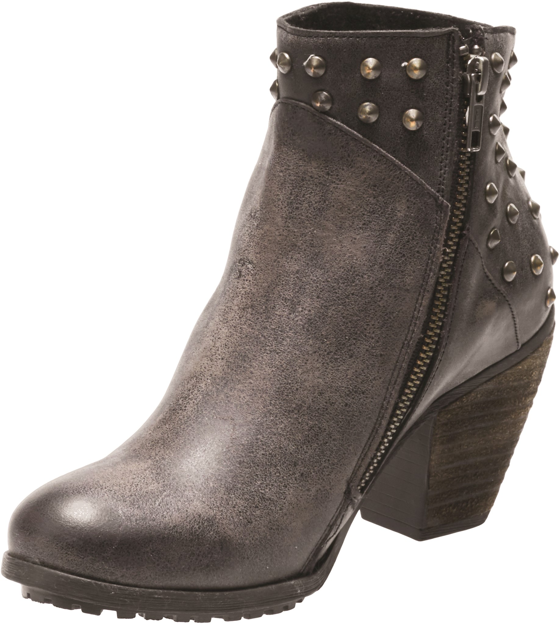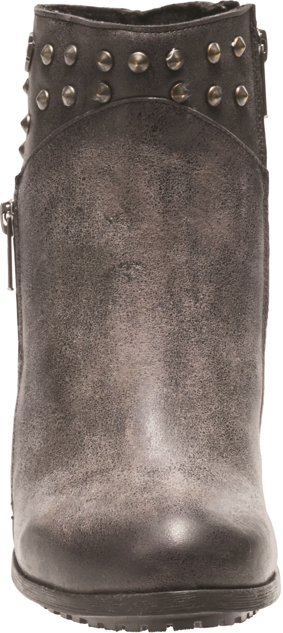 Step into freedom with this studded style. The women's Wexford bootie features distressed full grain leather and enough H-D® edge to snap necks. A sassy yet sturdy 3" heel gives you the look you've been craving for your off the bike style. • Full grain leather upper • Pig skin lining • YKK® locking inside zipper • Cement construction • Rubber outsole • *Leather distressed for unique appearance • Made in Mexico • Shaft Height: 3.75 • Heel Height: 3