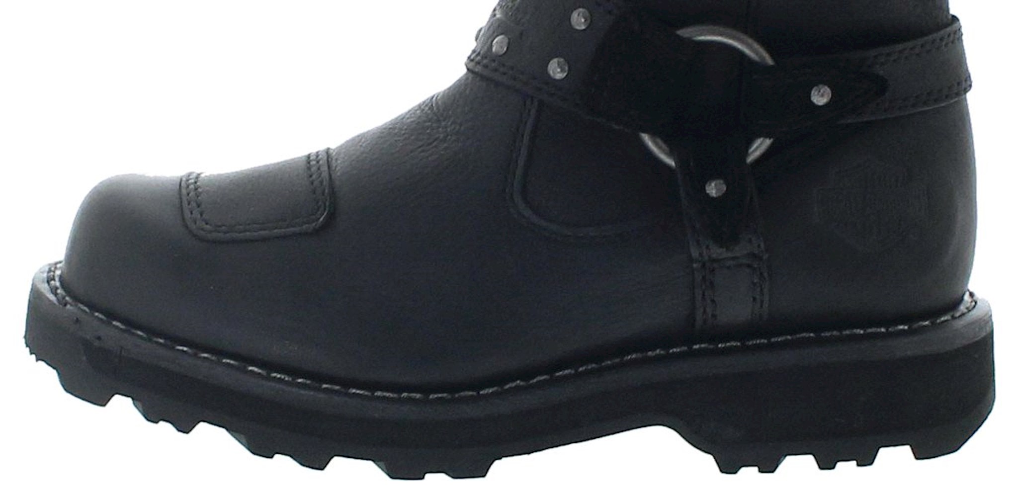 Modieuze dames enkellaars met binnenzool en binnenritssluiting. Binnenin: Het complete interieur is gemaakt van een ademende Soft Mesh voering. De schokabsorberende binnenzool is niet vervangbaar. Speciale kenmerken: De laarzen zijn CE-gecertificeerd volgens de DIN-norm EU ISO 13634-2015. In geval van een ongeval moeten de motorlaarzen de voeten, eventueel de enkels en ook een deel van het scheenbeen tot op zekere hoogte beschermen. Deze hebben geen invloed op de bediening van de motorfiets of de bediening van de voethendels. De norm EN ISO 13634-2005 definieert de basisvereisten. De Europese norm heeft betrekking op twee prestatieniveaus op het gebied van bescherming: Prestatieniveau 1 - Minimumniveau/geplaatste laarzen bieden bescherming bij een ongeval en optimaal comfort. Prestatieniveau 2 - Hogere prestatie-eisen / veterschoenen bieden bescherming bij een ongeval en optimaal comfort bij een hoger gewicht. De D86021 EDDINGTON CE heeft de volgende prestatie-eisen: FO - Oliebestendige buitenzool: vermogensniveau 2 SRA - slipweerstand: vermogensniveau 2 B - vochtdoorlatend: krachttrap 1 Uitvoering: De welted Harley-Davidson MARMORA CE Black laars is gemaakt van een zeer duurzaam gewaxt rundleer (FULL GRAIN LEATHER). De rubberen buitenzool is oliebestendig en kan ook achteraf worden opgelost. De slijtage van de zolen wordt verminderd door de verwerking van speciale rubbersoorten. Om het instappen te vergemakkelijken is er een 20 cm lange binnenrits in verwerkt.