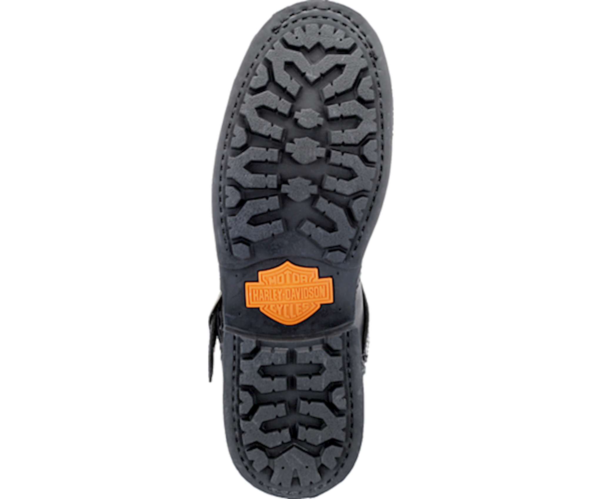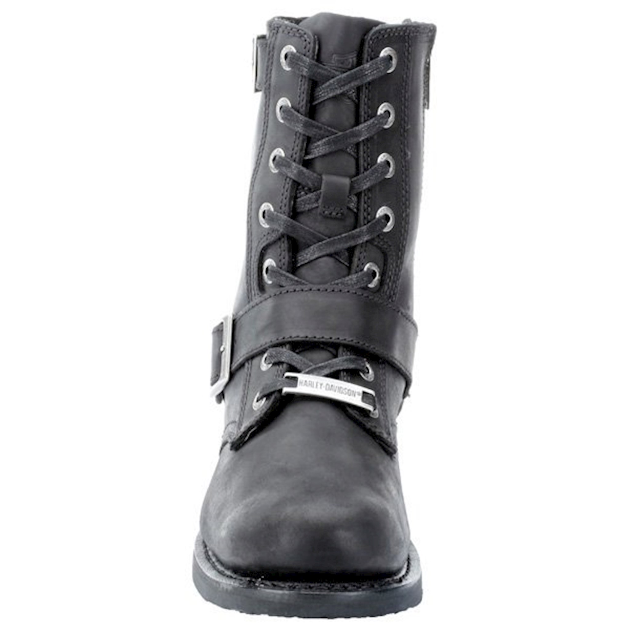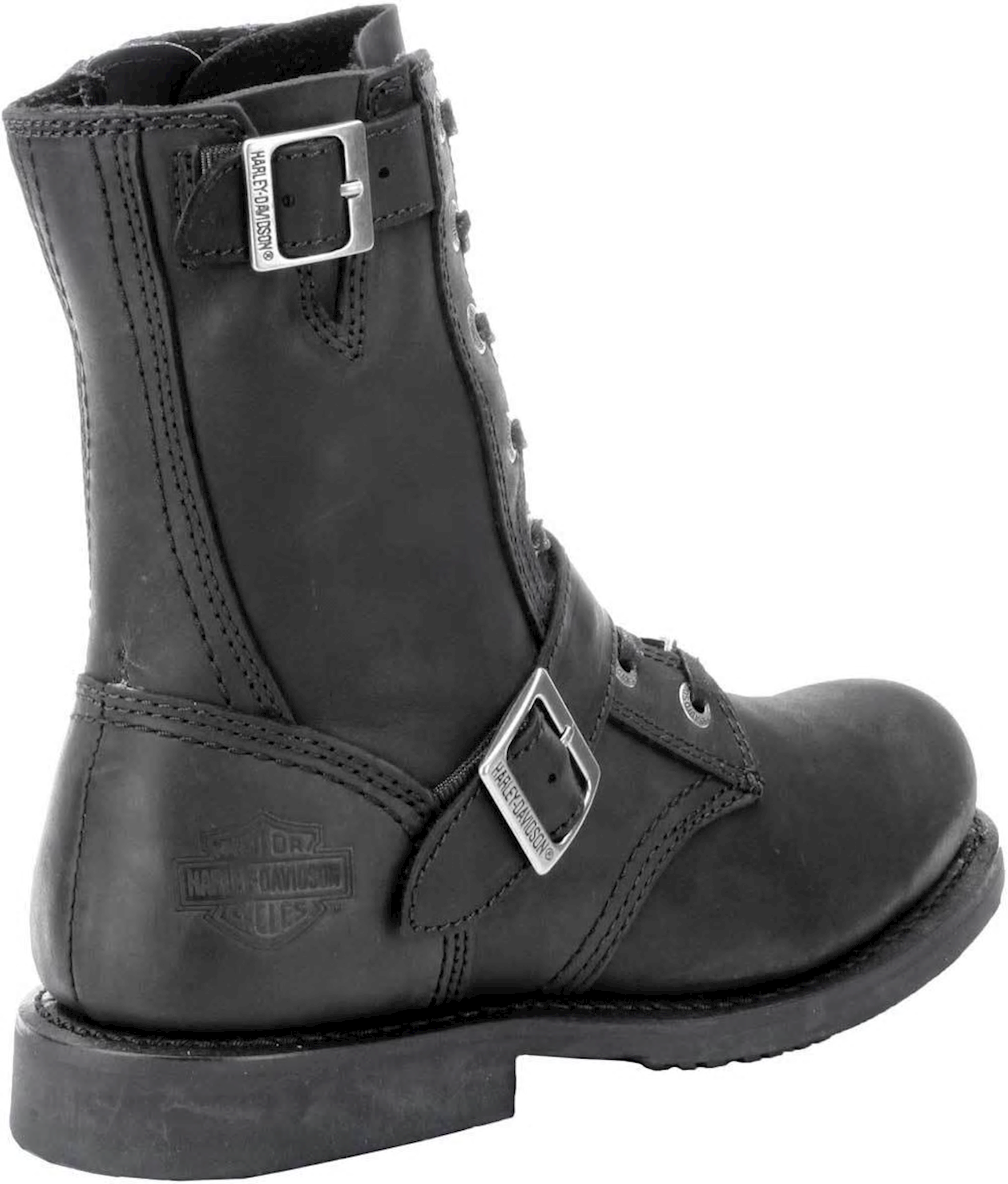 Harley-Davidson® Men's black leather motorcycle lace-up boots. Styled with cross-straps and H-D logo buckles. Uppers made from full grain leather with embossed H-D badging on sides of heels. Designed with a comfortable full-length cushioned sock lining, affording hours of comfortable wear. Shaft height: 8", Heel height: 1". Features industry's best YKK® locking inside zippers for easy on and off. Rubber outsole means sure-footed foot placement. The boot's sole, insole and upper are bound using Goodyear® Welt construction processes, the most labor intensive and durable construction method available.