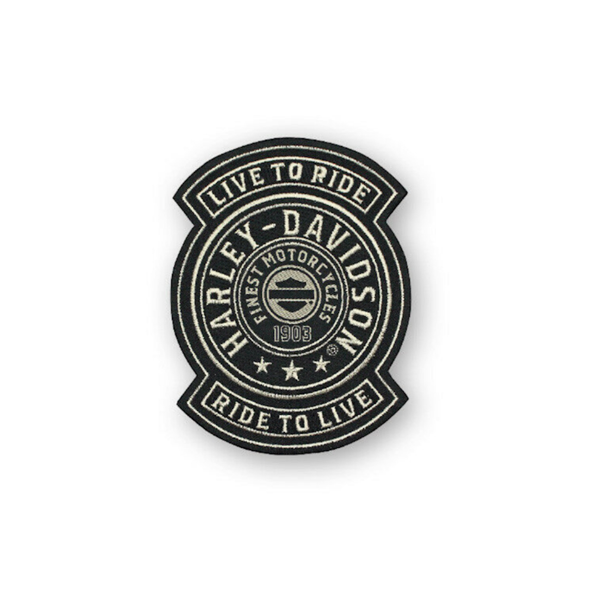 Harley-Davidson® Embroidered Harley Shield Emblem Small size patch. Awesome embroidered Harley-Davidson® script design with the famous "Live To Ride, Ride To Live" text. Size: 3.75" W x 4.75" H.