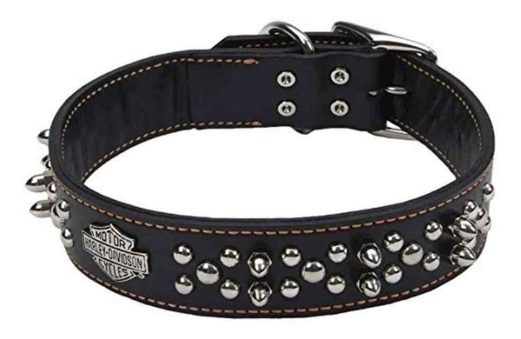 Harley-Davidson® Leather Double Row Spiked Collar. Comes in Size: 24" length, 1.5" wide. For Large size dogs. Adjustable for a custom fit, comfortable for your dog to wear all day long. Features awesome rounded spikes with a famous Bar & Shield logo. Black leather with contrasting orange thread. For that Harley® dog that deserves the best!