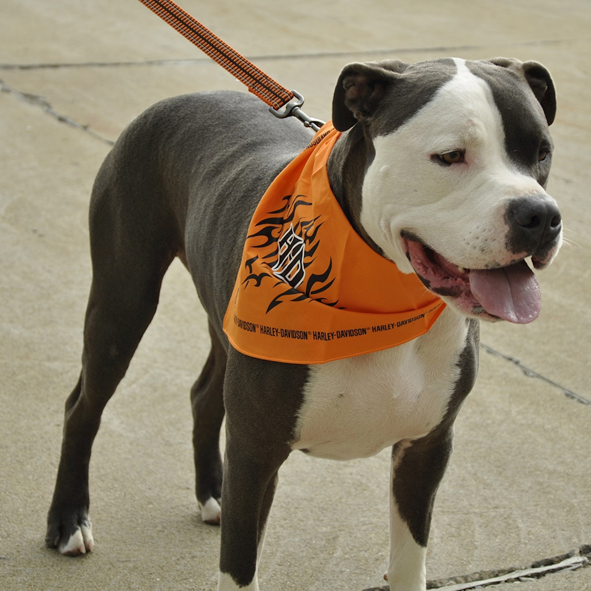 Harley-Davidson® tribal flames pet bandana Made of orange cotton blend. Features tribal flame design. Finished rolled edges sewn for extra durability.