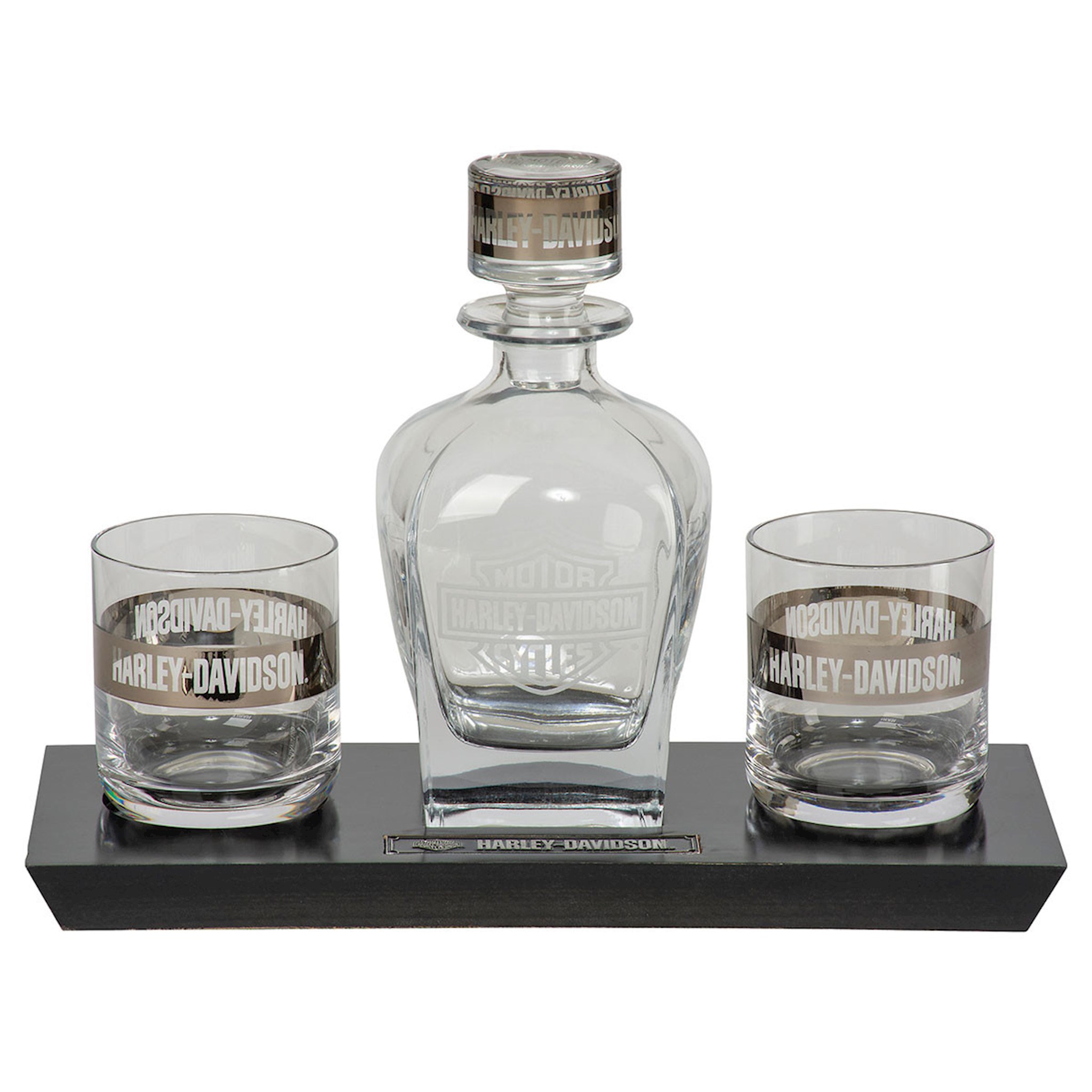 Set includes 23 oz. / 700 ml glass decanter with etched Bar & Shield logo and two 8.5 oz. / 250 ml glasses with metallic electroplated accents. Harley-Davidson logo on glasses and glass decanter stopper. Includes wood display tray with H-D medallion and an additional cork stopper. Hand wash only. Tray Dimensions: 13" L x 1" H x 5.5" D / 33 x 3 x 14 cm.