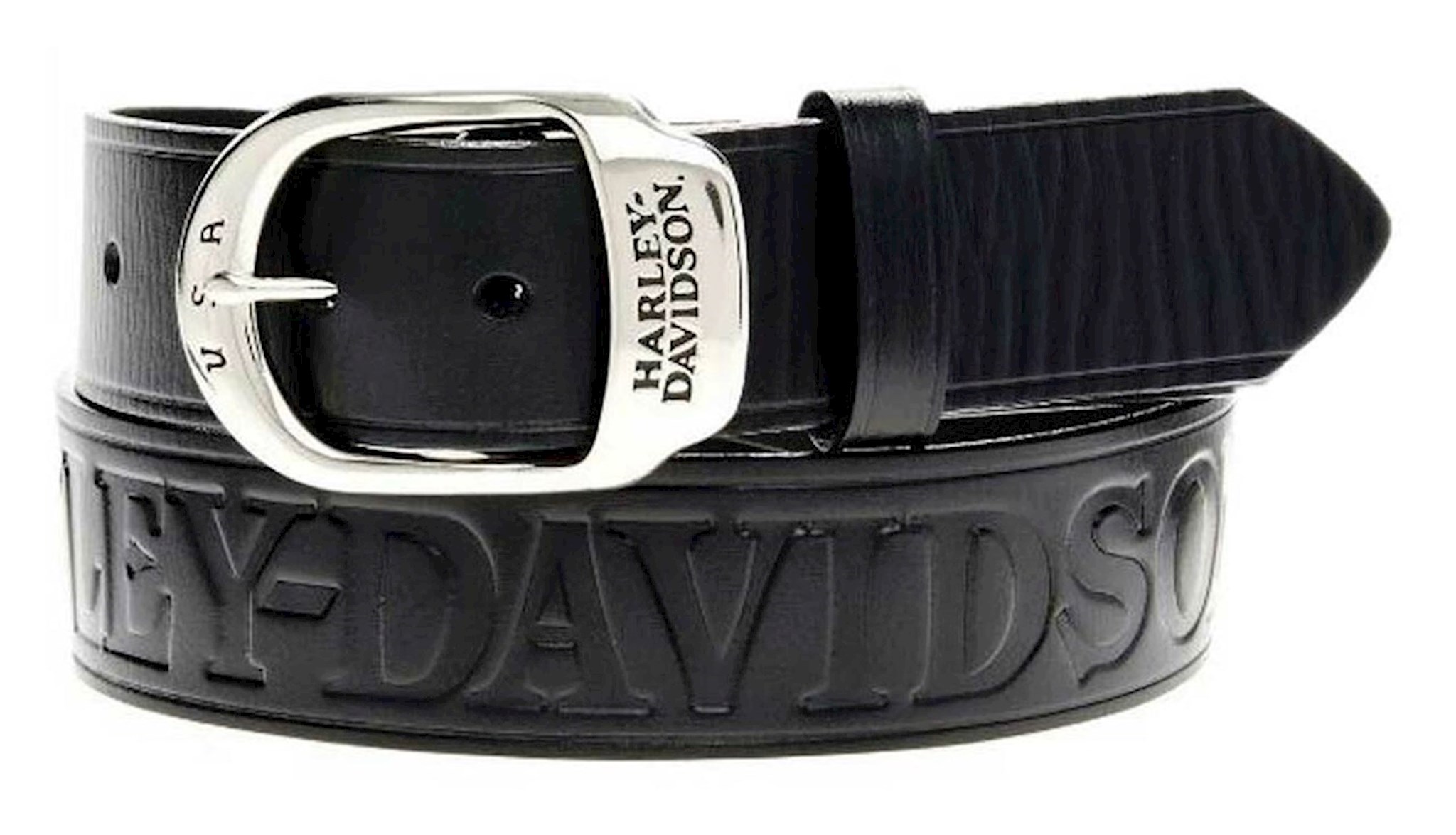 Harley-Davidson® Men's Slide Over Black Leather Belt and Buckle, HDMBT10588. With a shiny chrome finished buckle, you’ll want to wear this belt every day. The buckle has an engraved black enamel filled Harley-Davidson® logo where the prong rests. A leather keeper keeps the belt properly positioned. A large Harley-Davidson® logo, in block lettering, is debossed across the backside of the belt. The belt is a standard 1.5-inches in width. The buckle can be interchanged with your other Harley® buckles, too, making this belt a versatile addition to your wardrobe. Made to include large men with sizes from 32 to 50-inches.