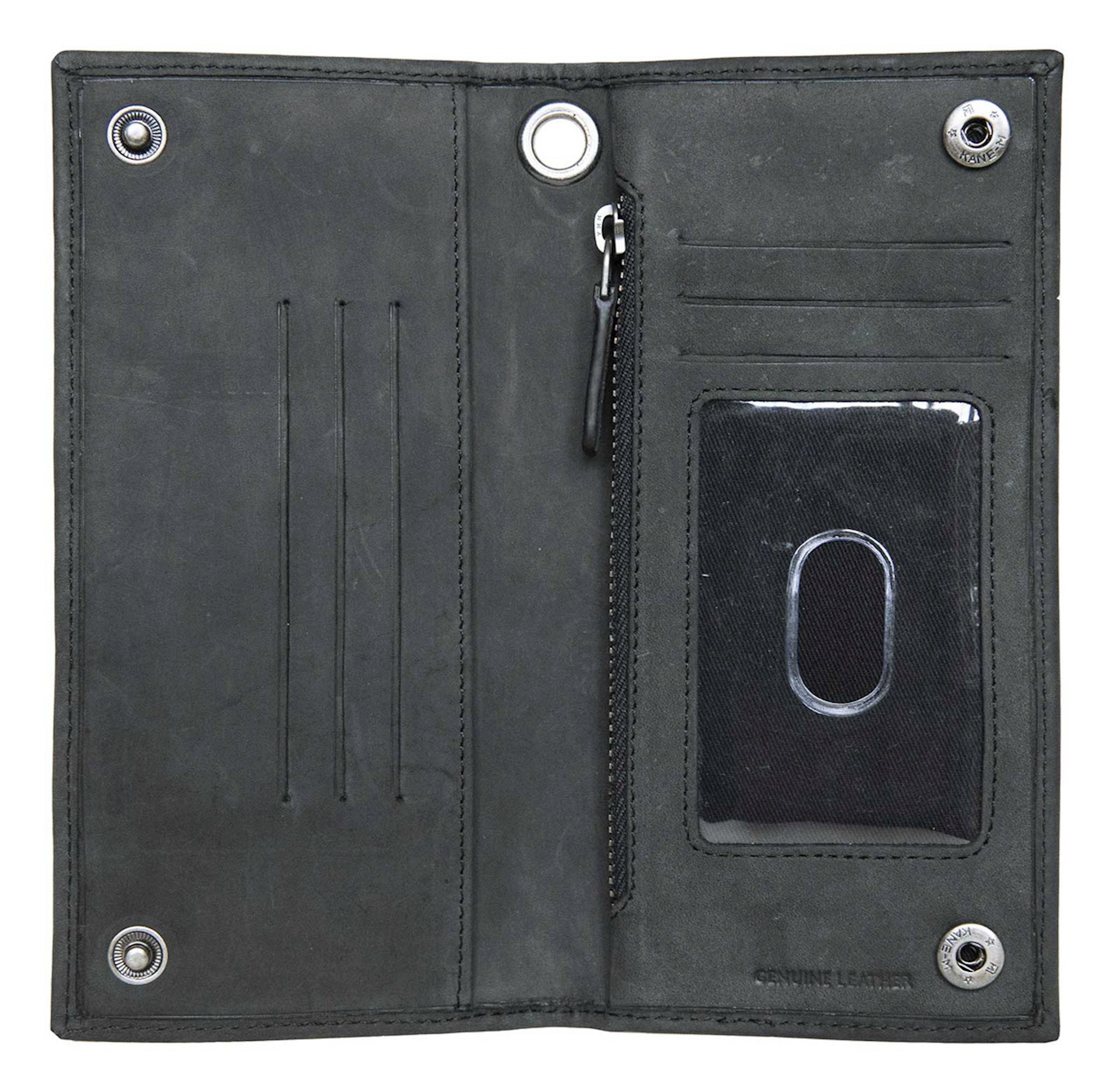 Harley-Davidson® Men's Eagle Trucker Wallet - Black, HDMWA11776-BLK. Made of high-quality black genuine leather with a super soft smooth feel. The best materials make up the long-lasting wallets. Features an iconic debossed Eagle Bar & Shield logo. Interior features: 5 credit card slots, ID window, zippered coin pocket and 2 large cash slip pockets. Antique nickel finish. RFID Protection, blocks hackers from reading your information. Size: 7" x 3.5".