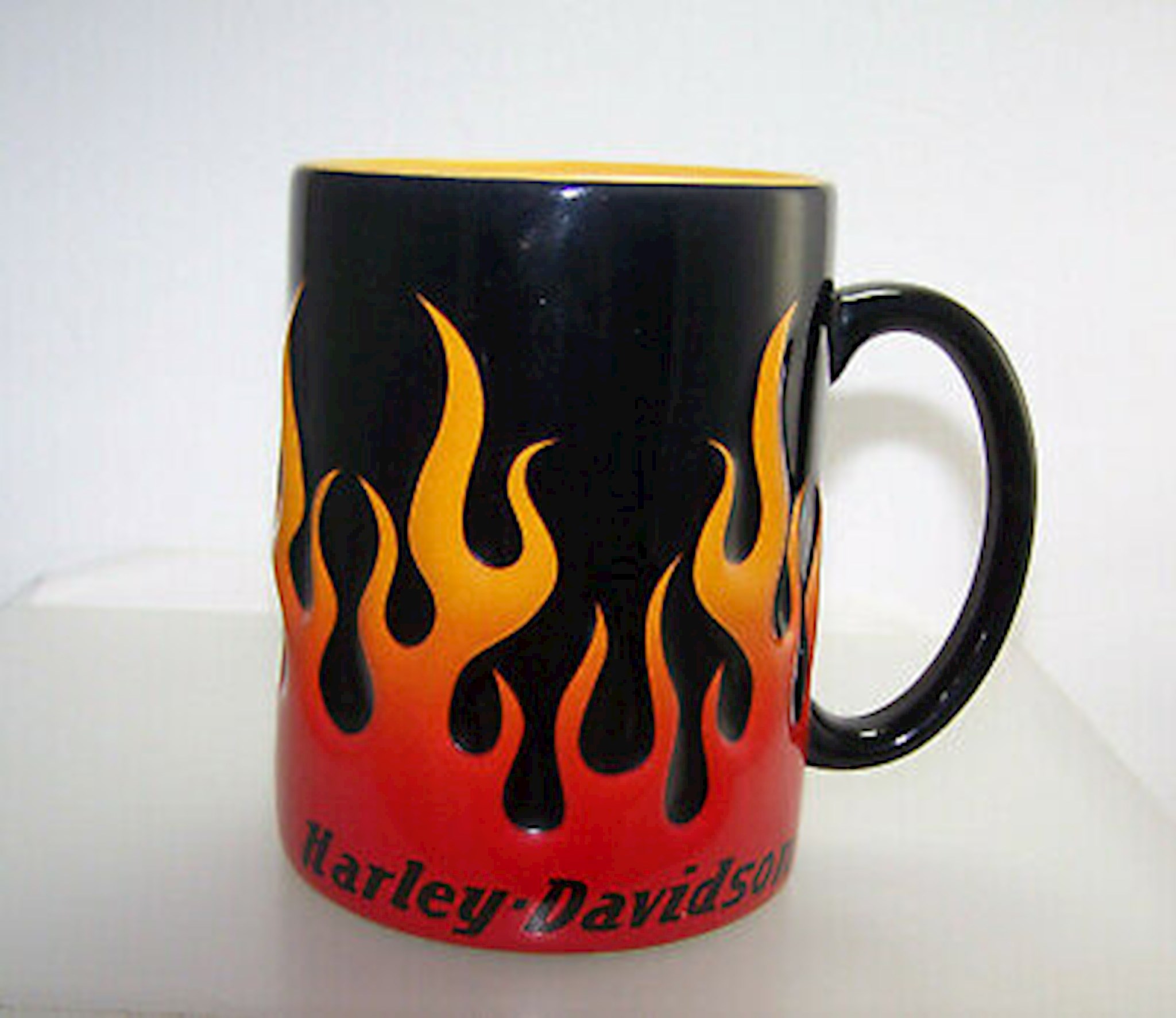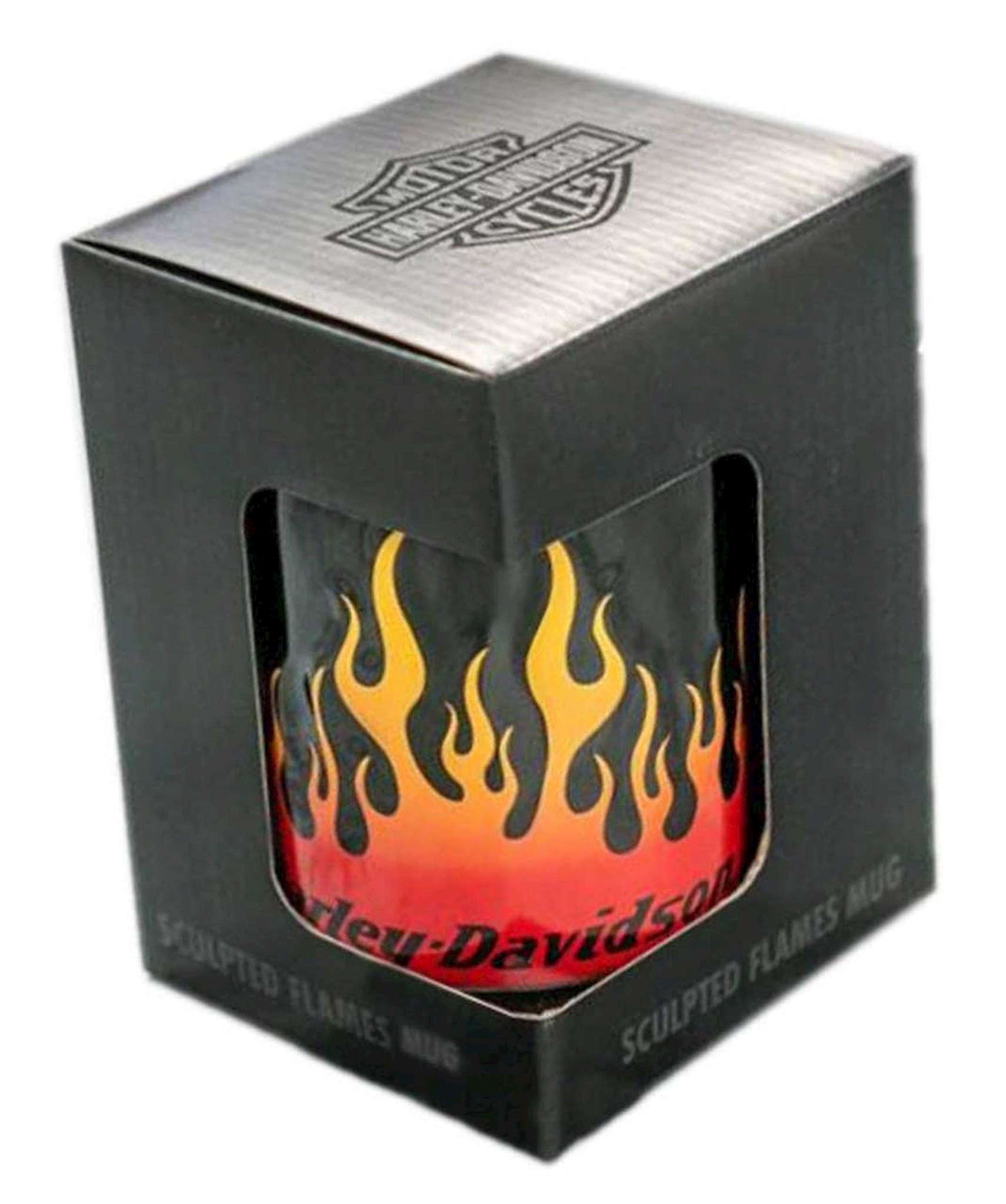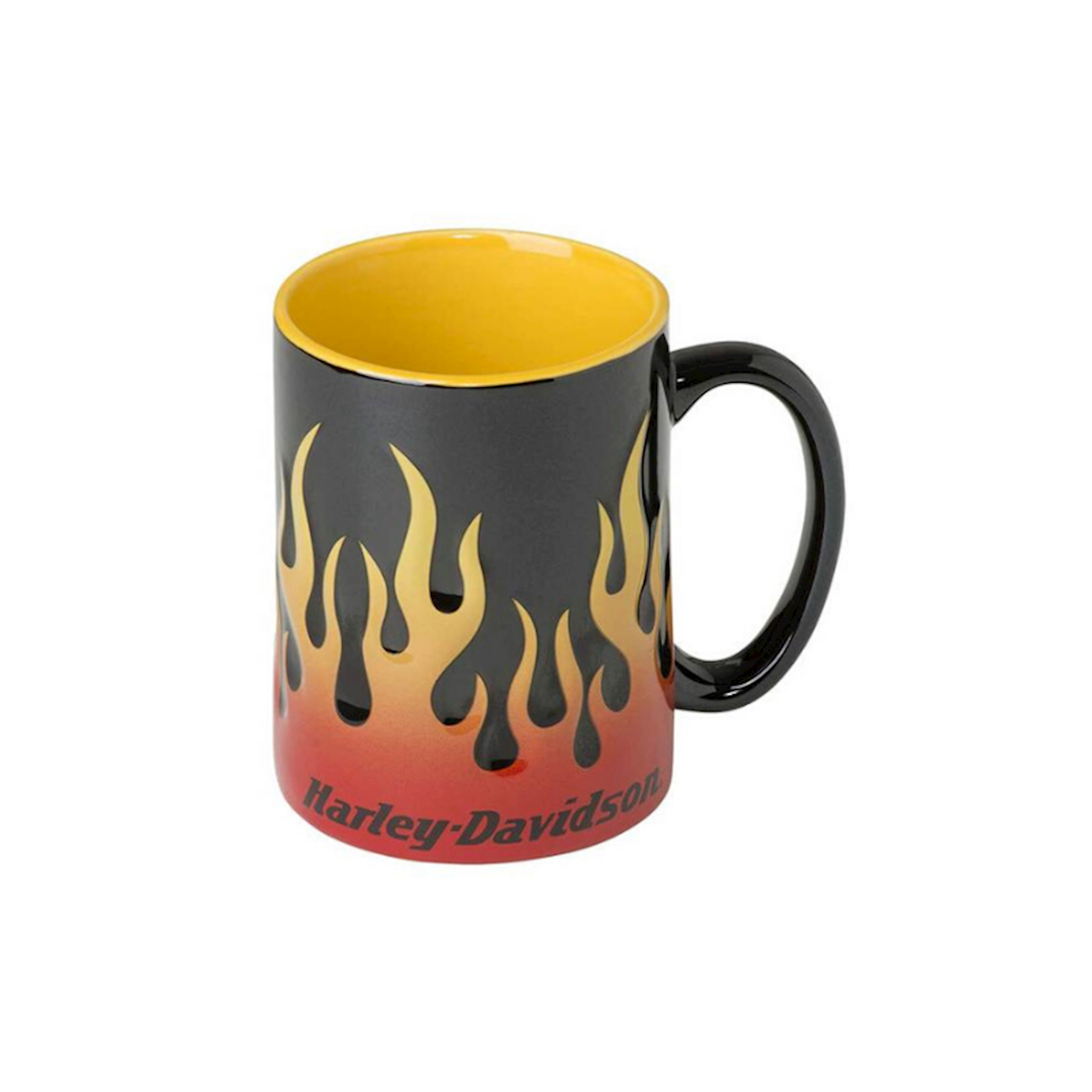 Harley-Davidson® Core Sculpted Flames 15-Ounce Coffee Mug – Red, Yellow, Black, HDX-98604. Grab a handful of your favorite brew with this sculpted, 3-dimensional flames 15-ounce ceramic coffee mug. Flames roar up from the base of the mug on a black background. The Harley-Davidson® logo is at the bottom. The interior is yellow and the handle is large. Feel free to heat in the microwave; it is also dishwasher safe. This particular mug is one of the more popular Harley® branded mugs around. As a gift, it’s perfect