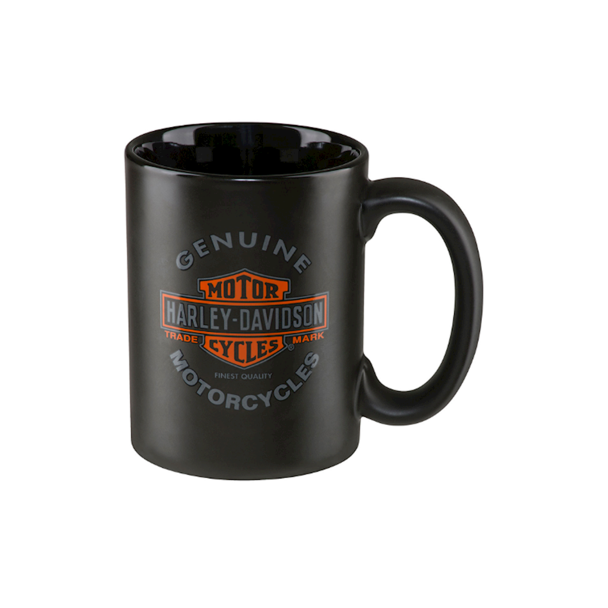 15 oz. / 450 ml ceramic mug. Matte black finish with decal Trademark logo on both sides. Dishwasher and microwave safe.