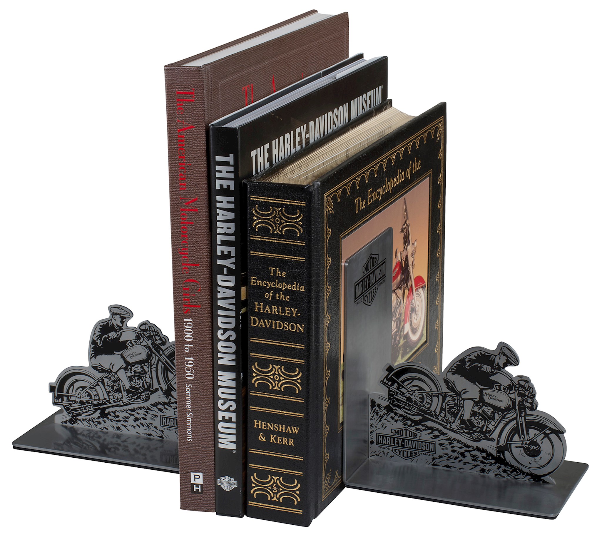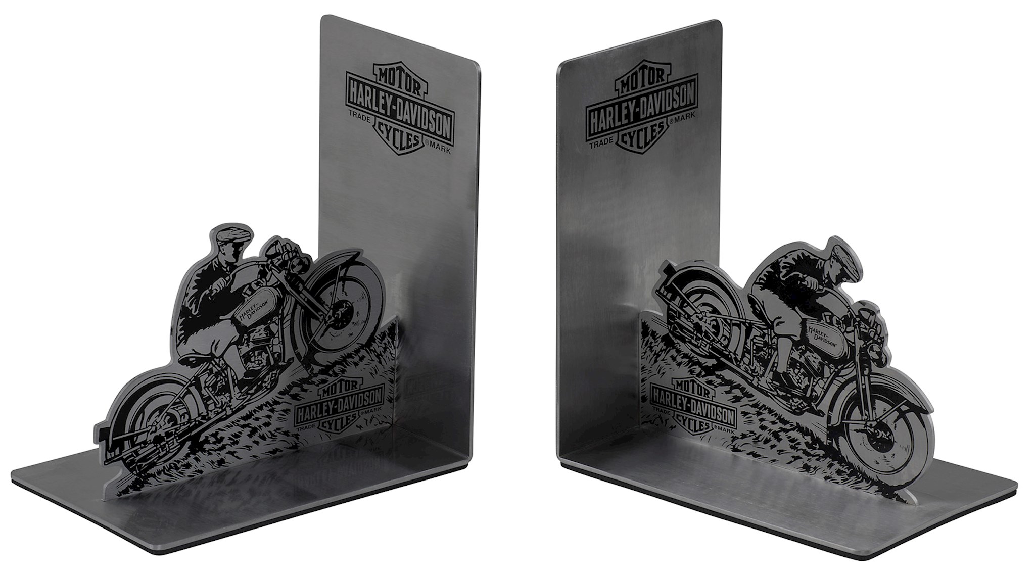 Set of two stainless steel bookends. Classic hill climber graphic and Trademark logo. Dimensions: 6" W x 6.5" H x 4" D / 15 x 17 x 10 cm.
