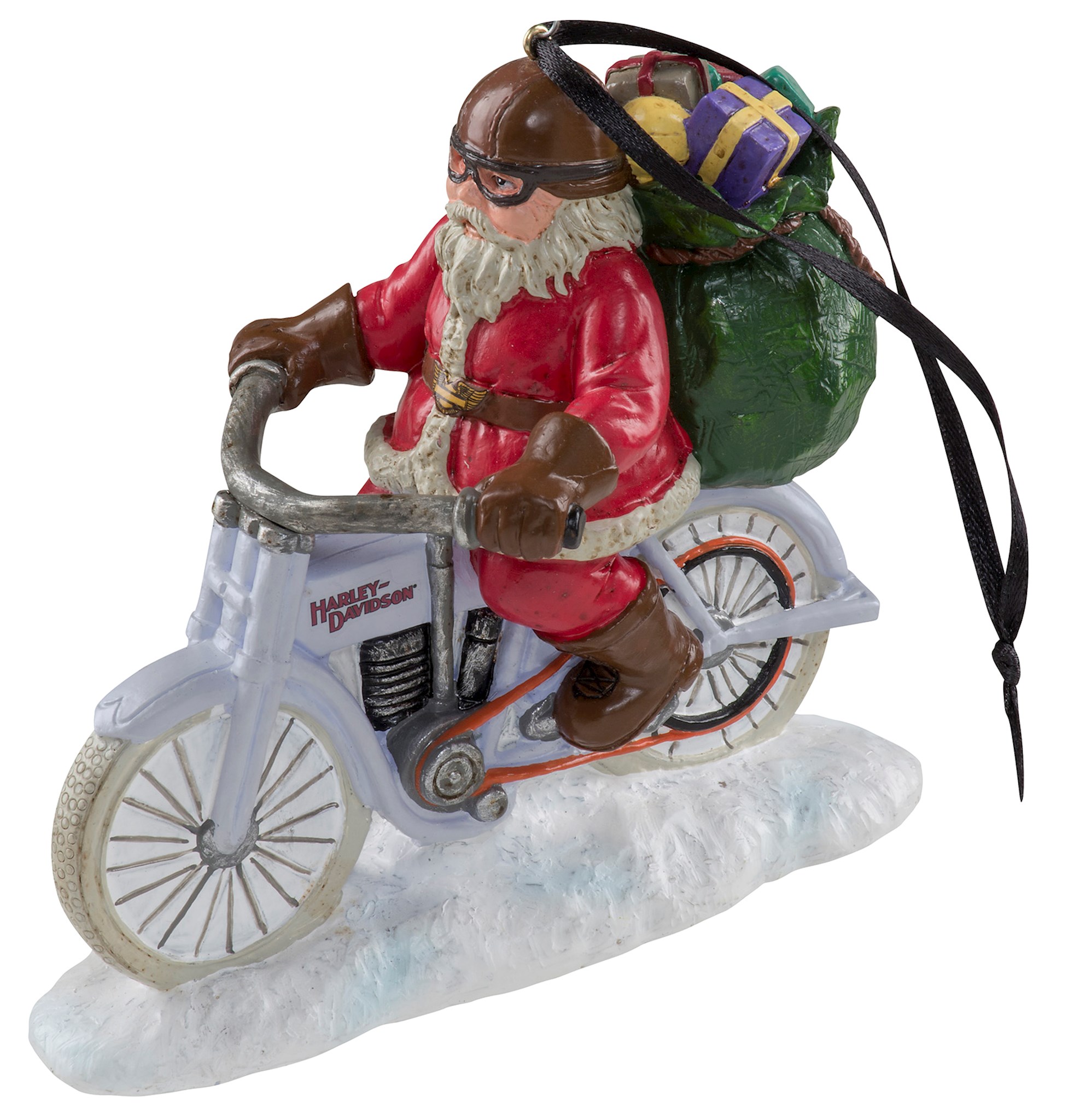 Polyresin ornament. Custom sculpted and hand painted Biker Santa. Features flat base to display or ribbon to hang. Dimensions: 4.5" W x 4.3" H x 2.75” D / 11 x 11 x 7 cm.