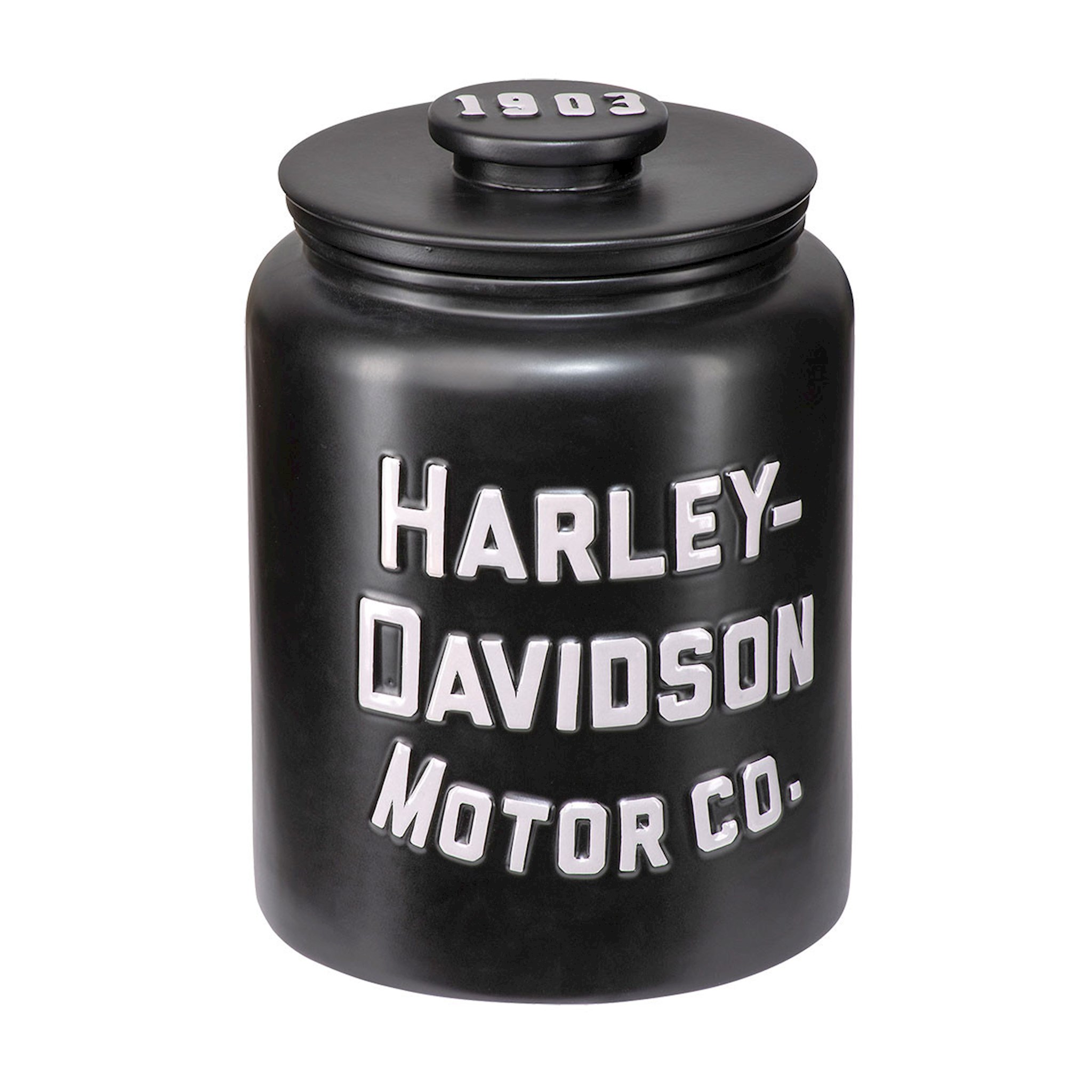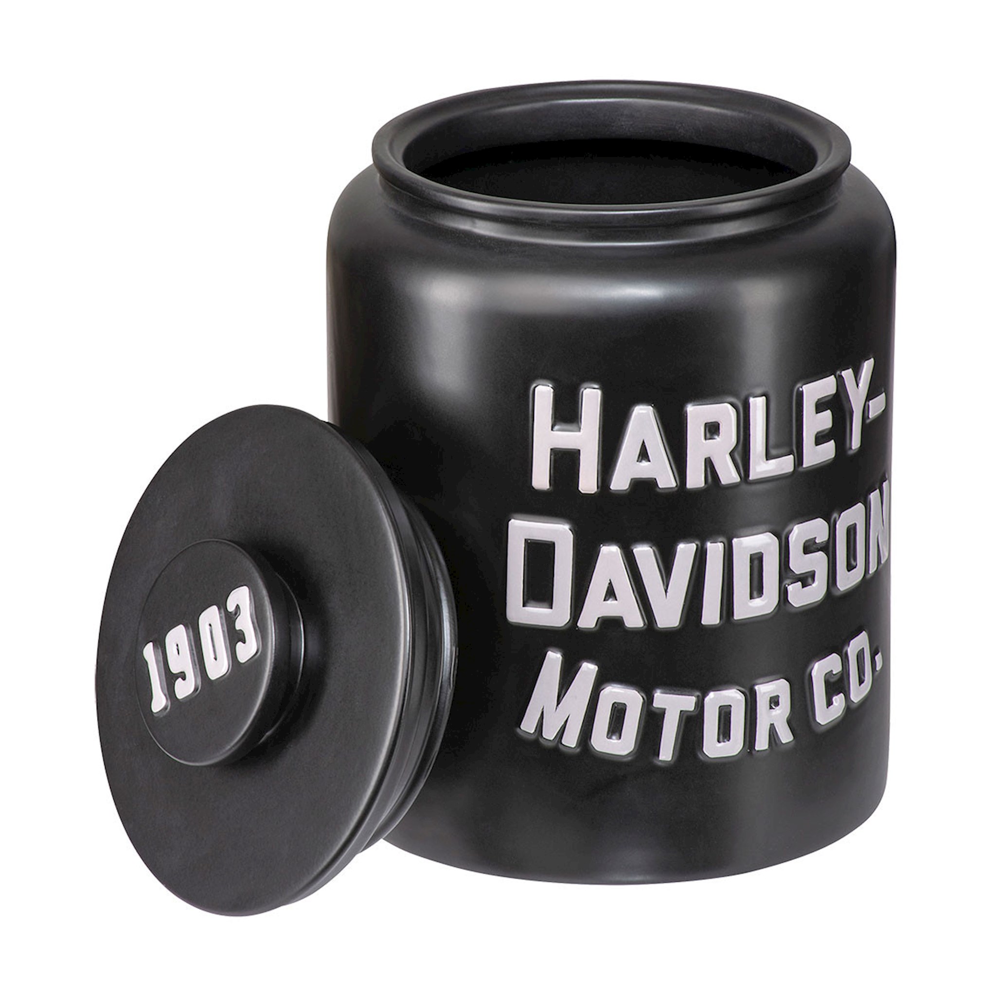 5.6 Qt. / 5 L Matte black ceramic cookie jar with sealed lid. Sculpted H-D Motor Co. logo on front and back. 1903 on lid. Dimensions: 8" diameter x 12" H / 20 x 30 cm.