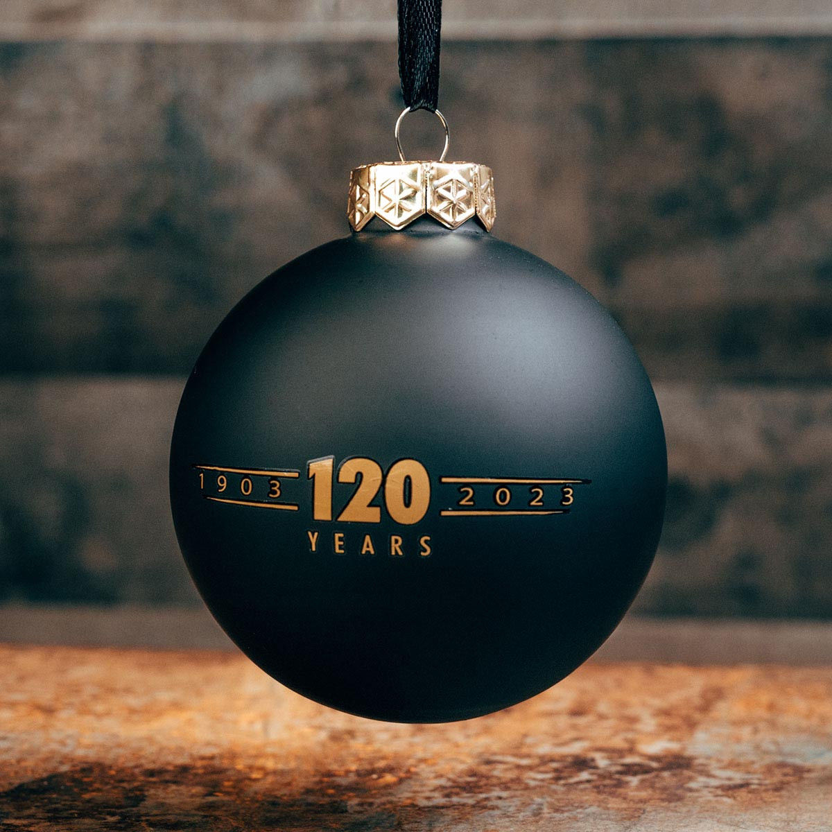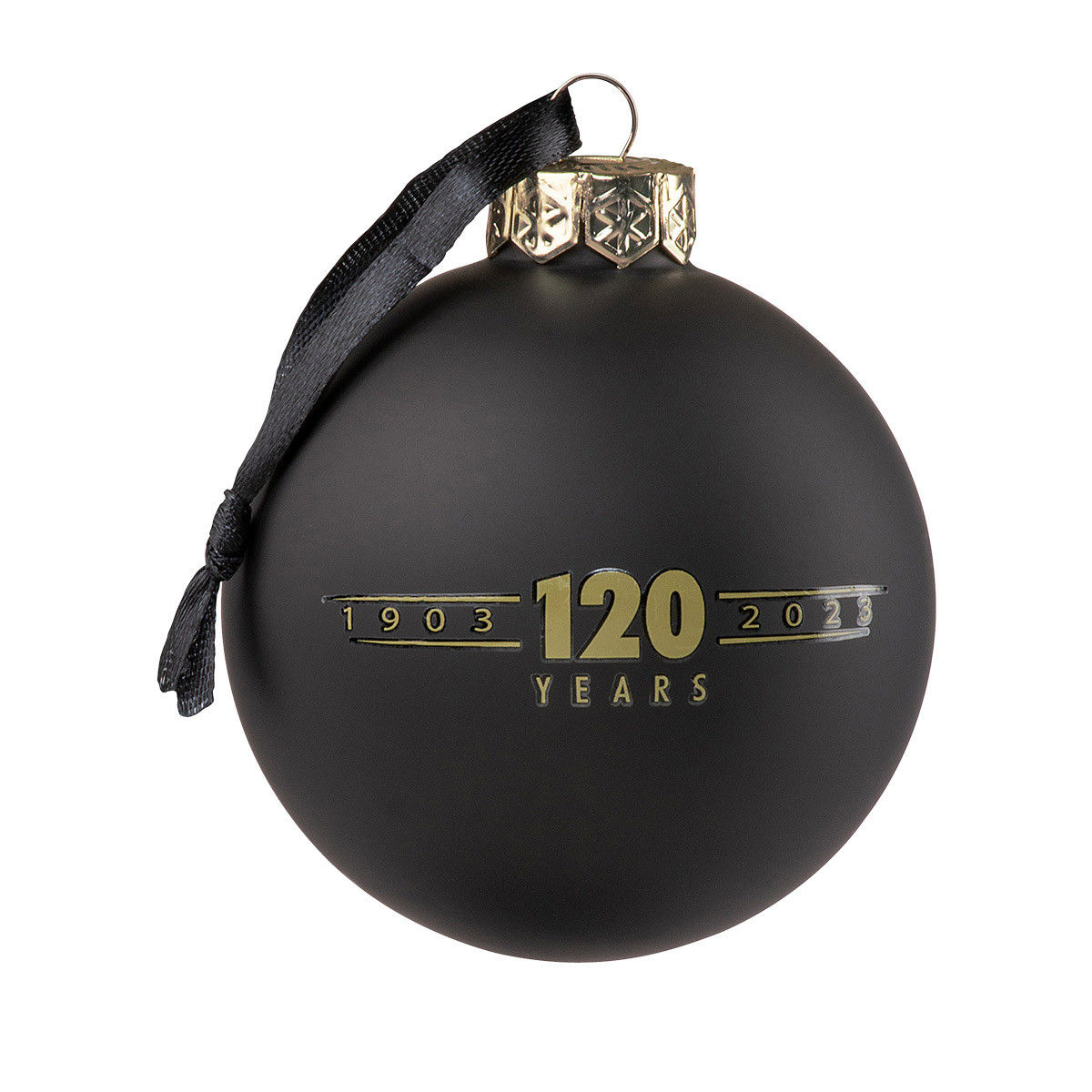 Harley-Davidson® 120th Anniversary 6 cm matzwart glazen bolornament met 120th Anniversary-logo's op de voor- en achterkant. Zwart satijnen lint om op te hangen.