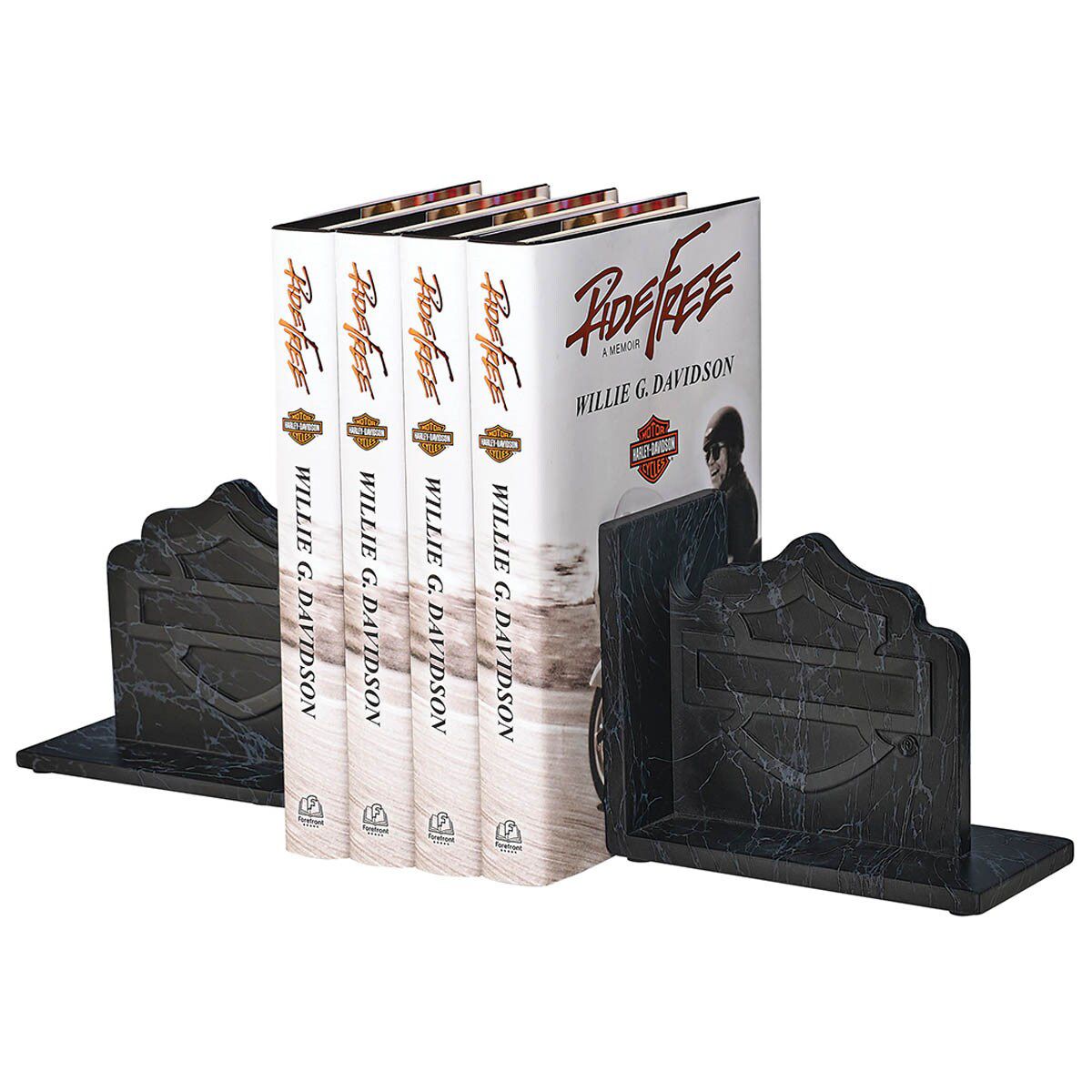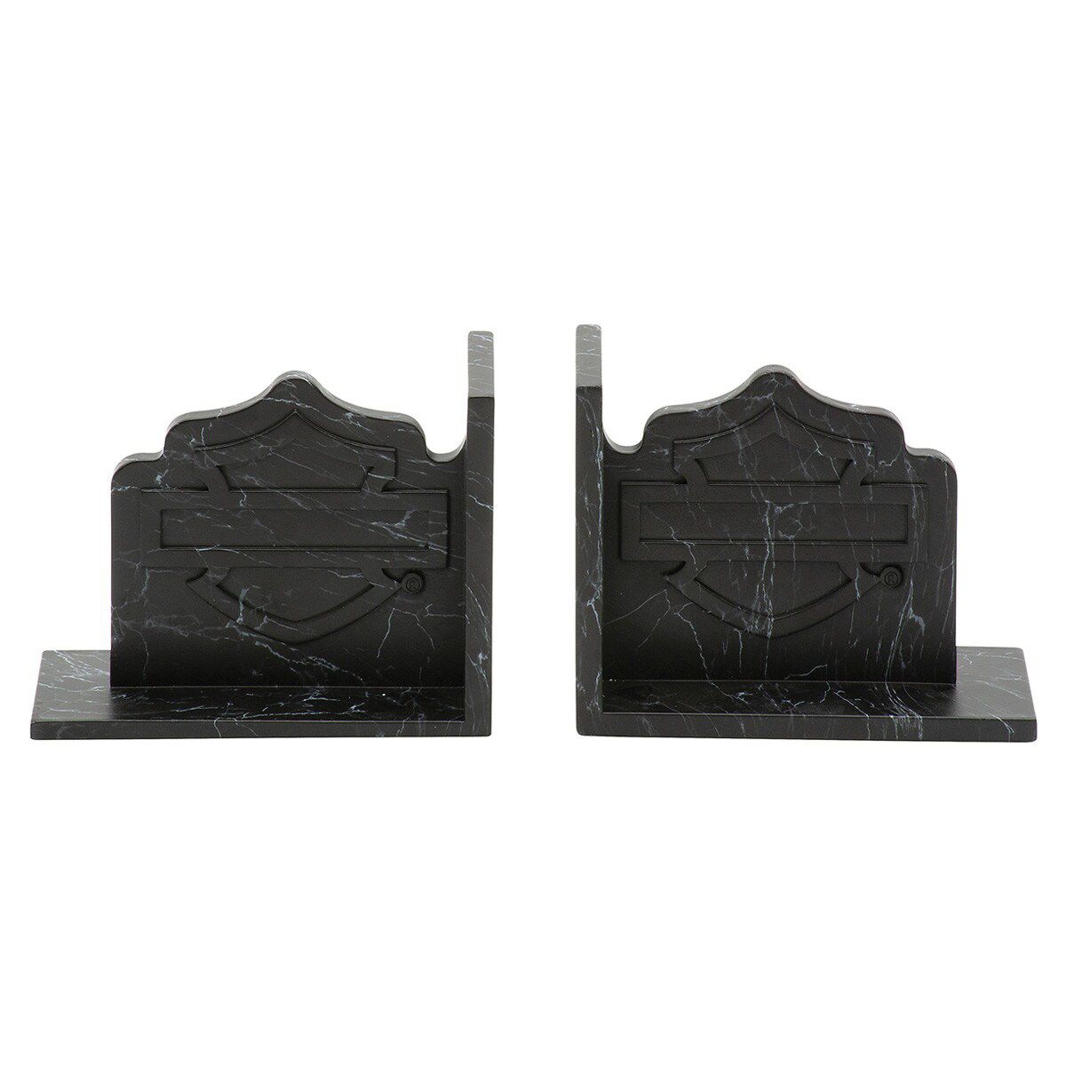 Set of two custom tooled resin bookends with dark grey marble finish. Contoured profile with embossed Open Bar & Shield logo. Dimensions: 6.2" W x 5" H x 2" D / 16 x 13 x 8 cm.