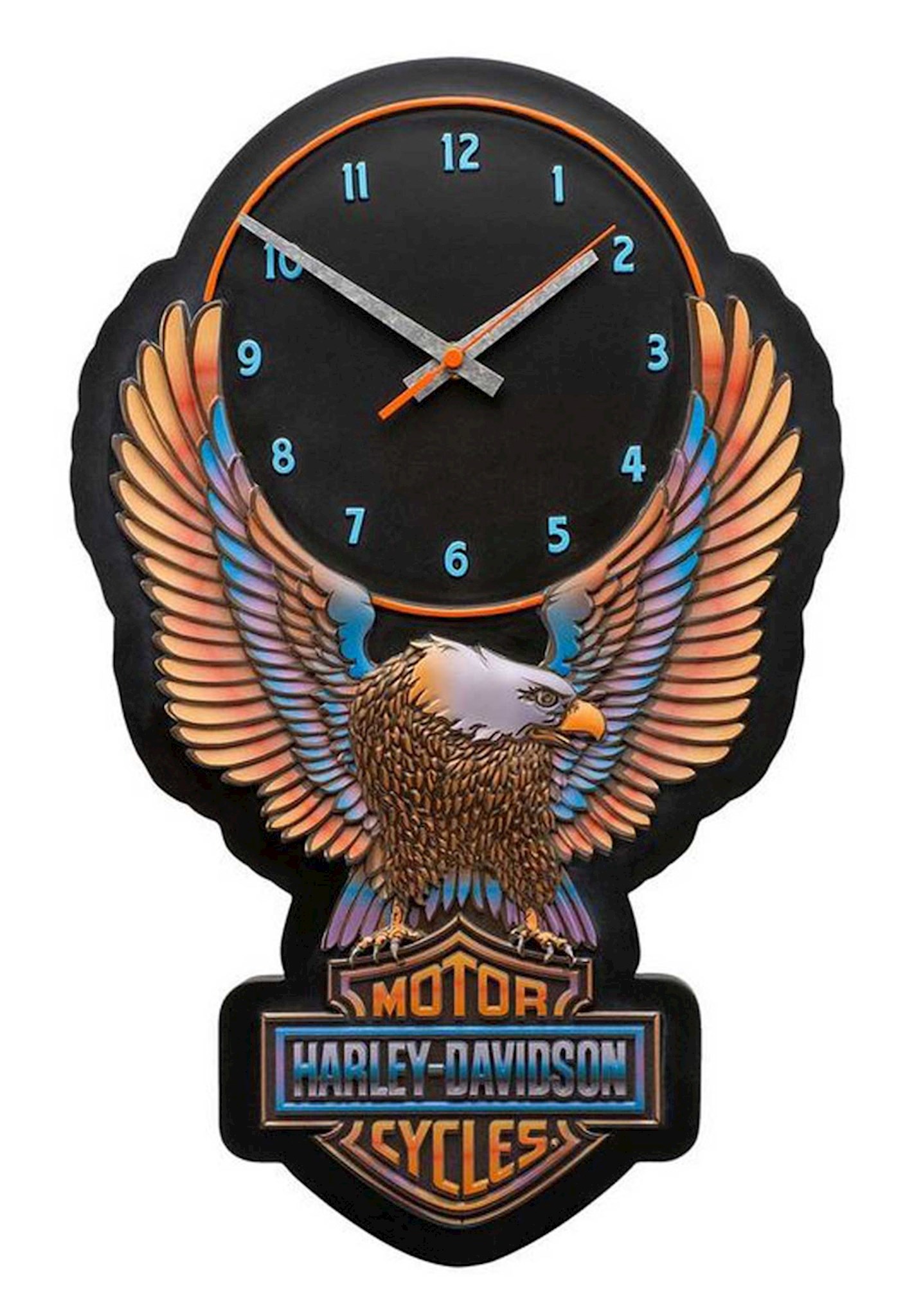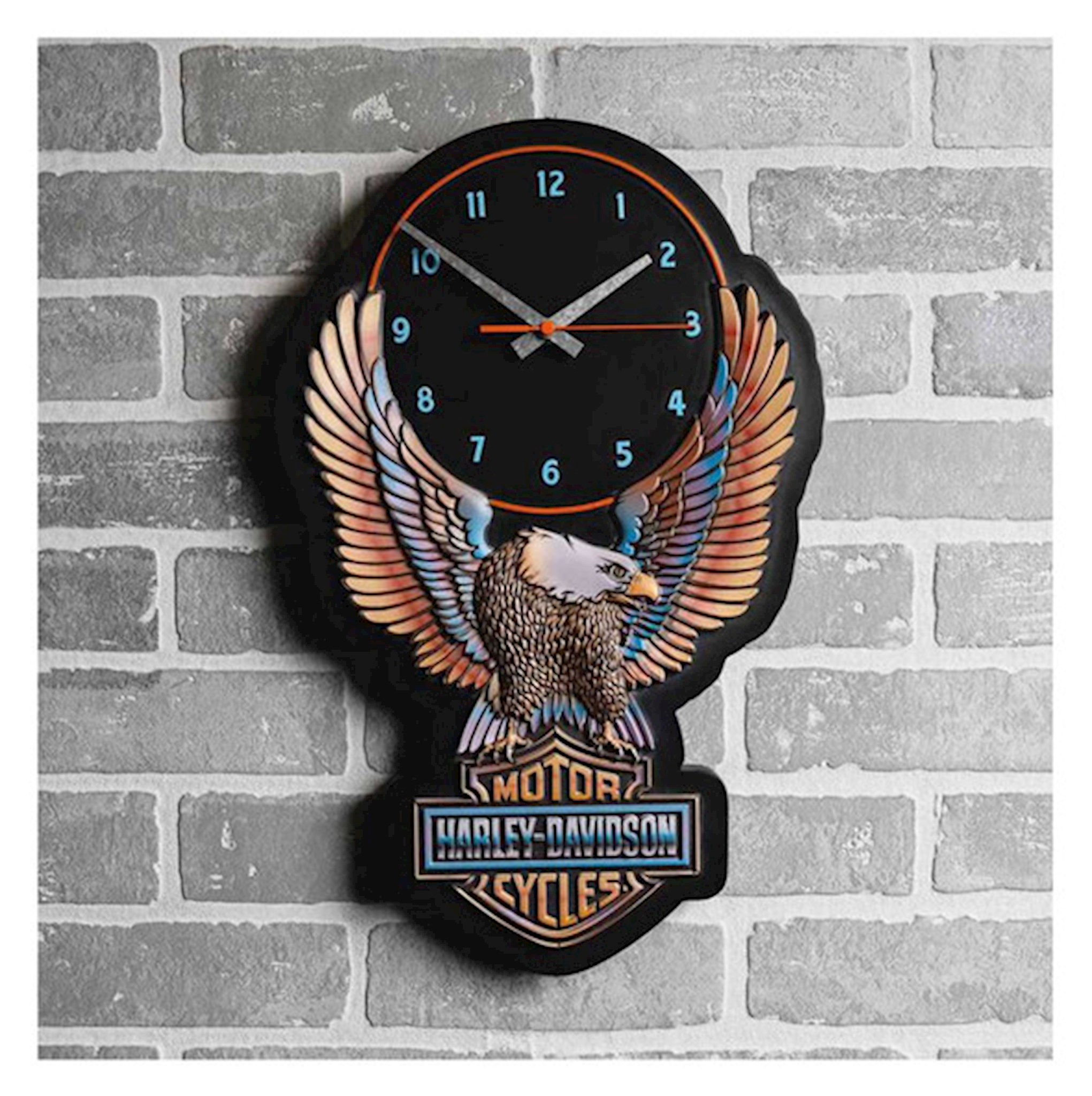 Harley-Davidson® Vivid B&S Eagle Outdoor Clock. Custom shaped resin outdoor clock features dimensional Vivid Bar & Shield Eagle logo. Standard Quartz movement requires one AA battery (not included). Dimensions: 11.5" W x 18" H x 2" D.