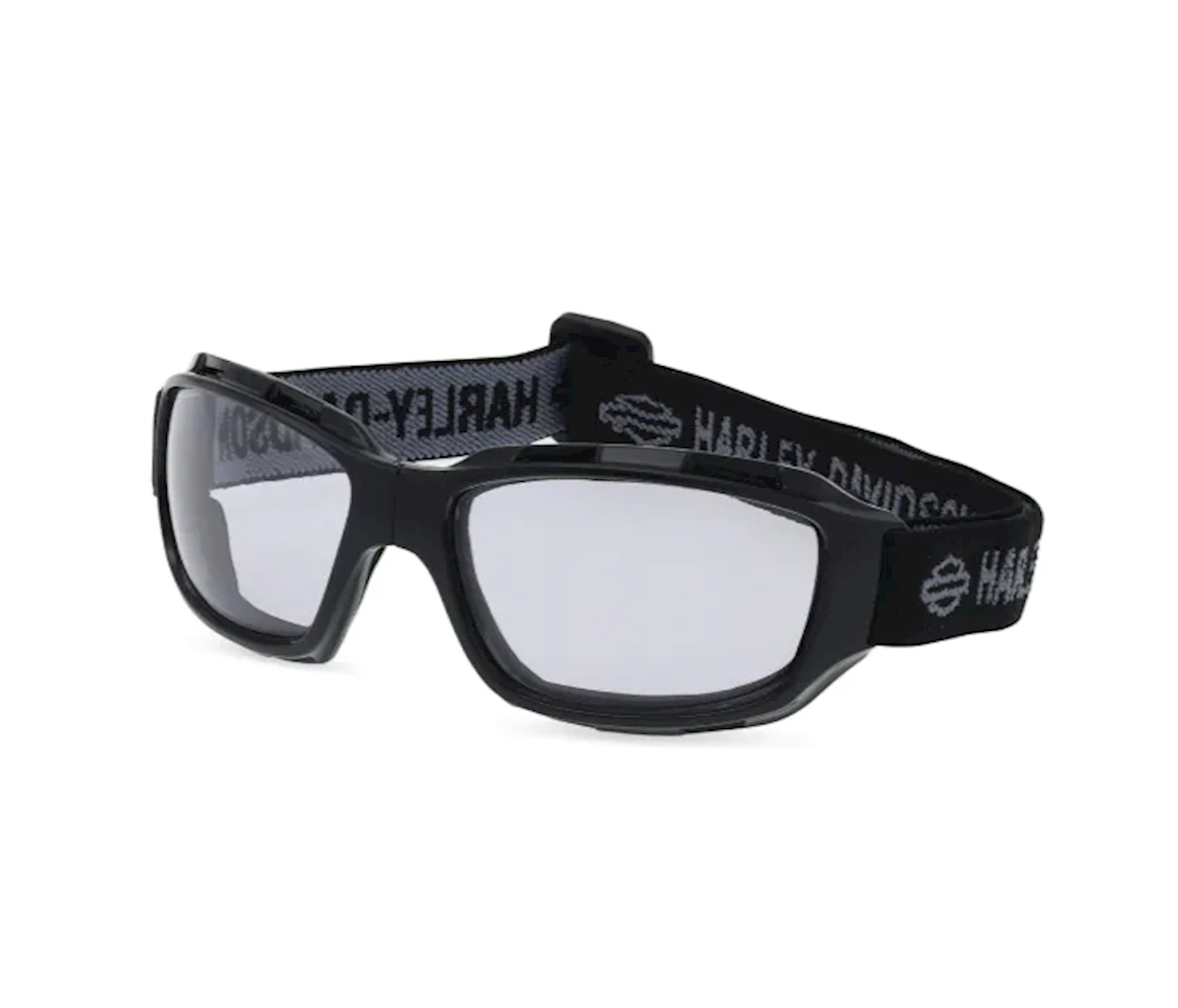 Harley-Davidson® Men's Battery Foldable Eyewear with headstrap. Matte black frames and black headstrap with light adjusting lenses. Square shaped frames that are made from high-quality plastic. Features a fixed gasket to help keep dust and dirt out of eyes. Adjustable headstrap.
