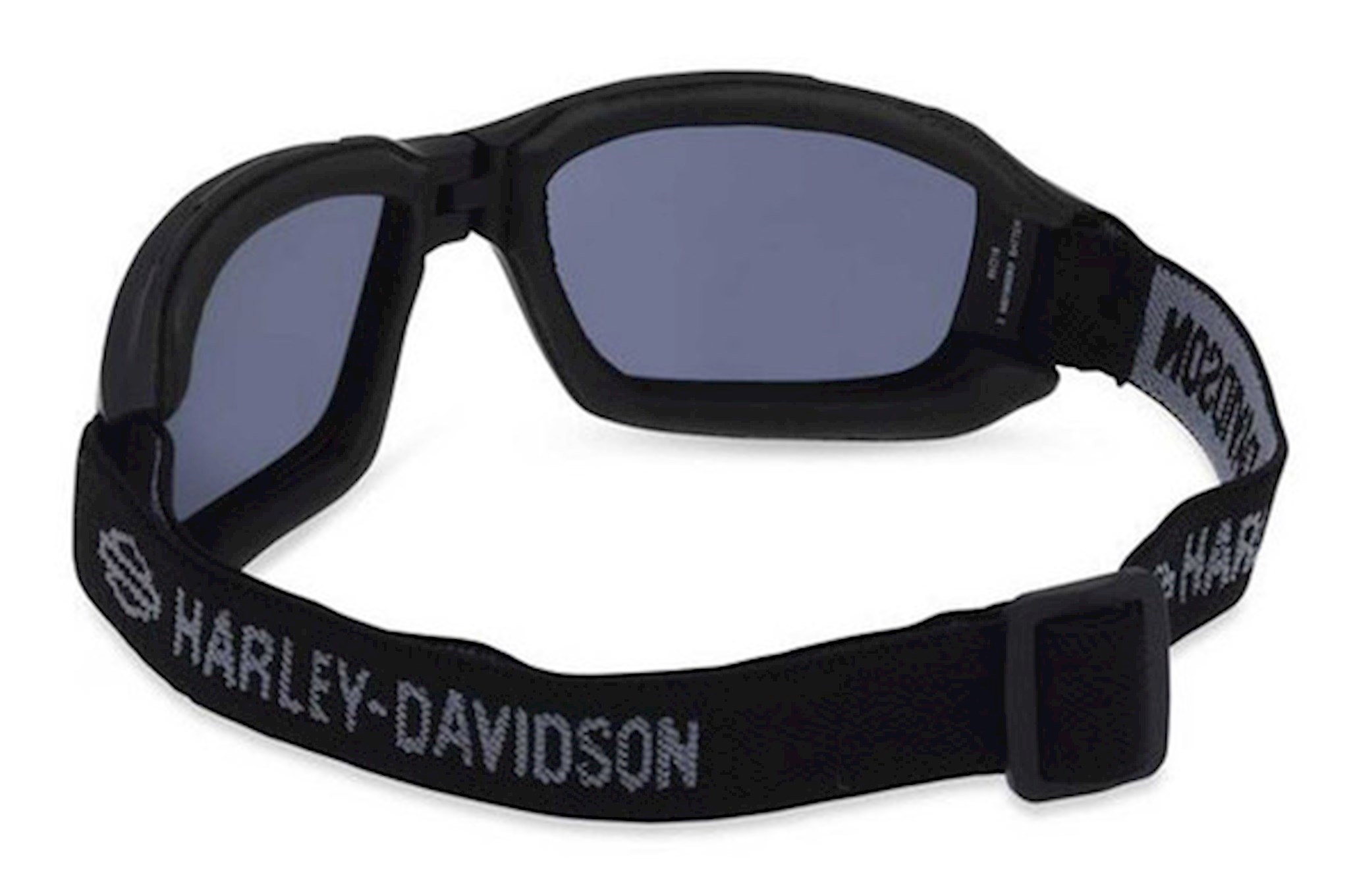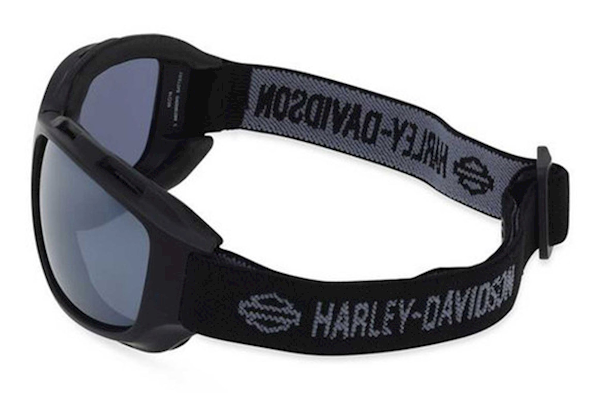 Harley-Davidson® Men's Battery Foldable Eyewear with headstrap. Matte black frames and black headstrap with high contrast smoke lenses. Square shaped frames that are made from high-quality plastic. Features a fixed gasket to help keep dust and dirt out of eyes. Adjustable headstrap.