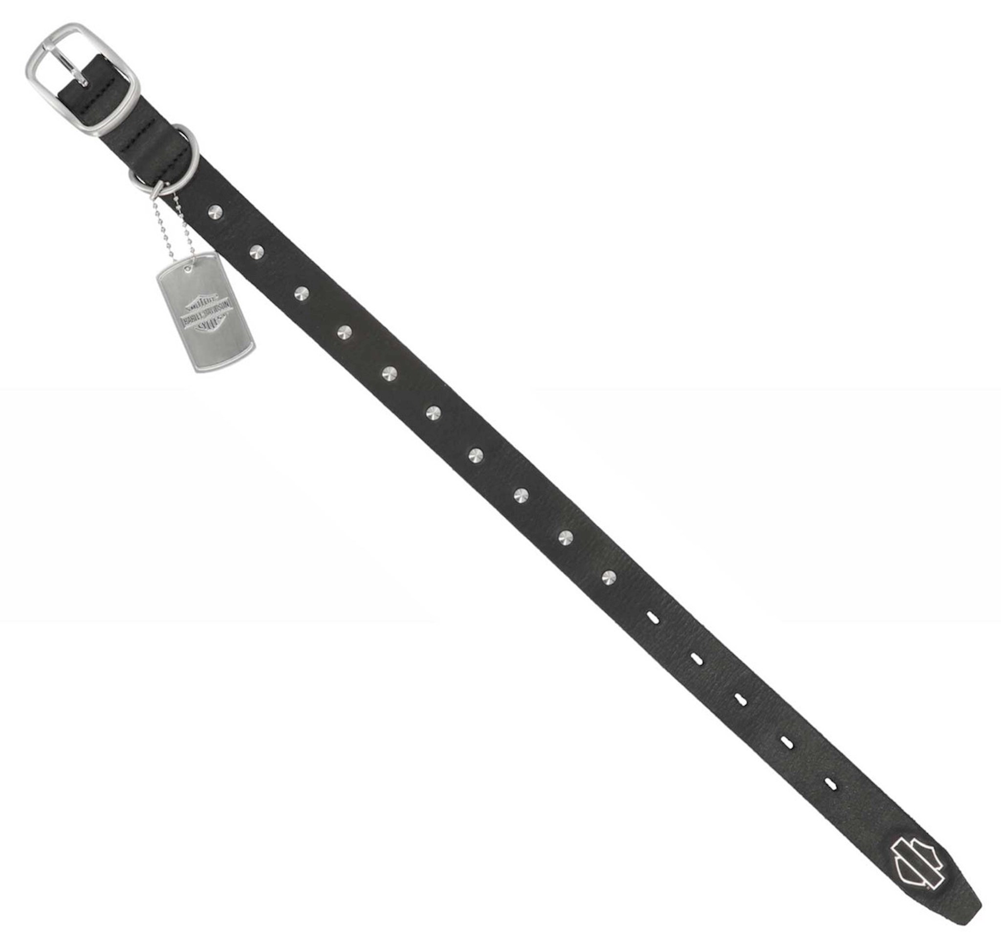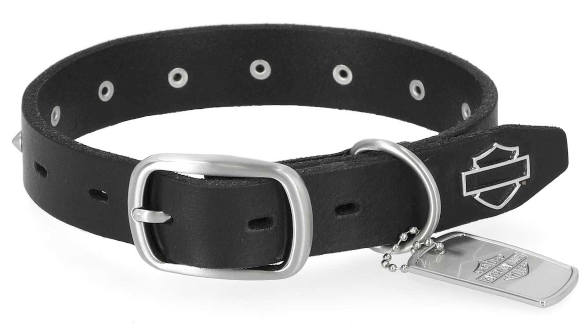 Harley-Davidson® Leather Pet Collar - Black, MPC262/08. Comes in sizes Small, Medium or Large. Size Small: 8" – 12". Size Medium: 13" - 17". Size Large: 19" - 23". Constructed from high-quality Genuine leather. Brushed silver hardware. Cone studs and Bar & Shield logo. Detachable laser etched dog tag with matte silver ball chain.
