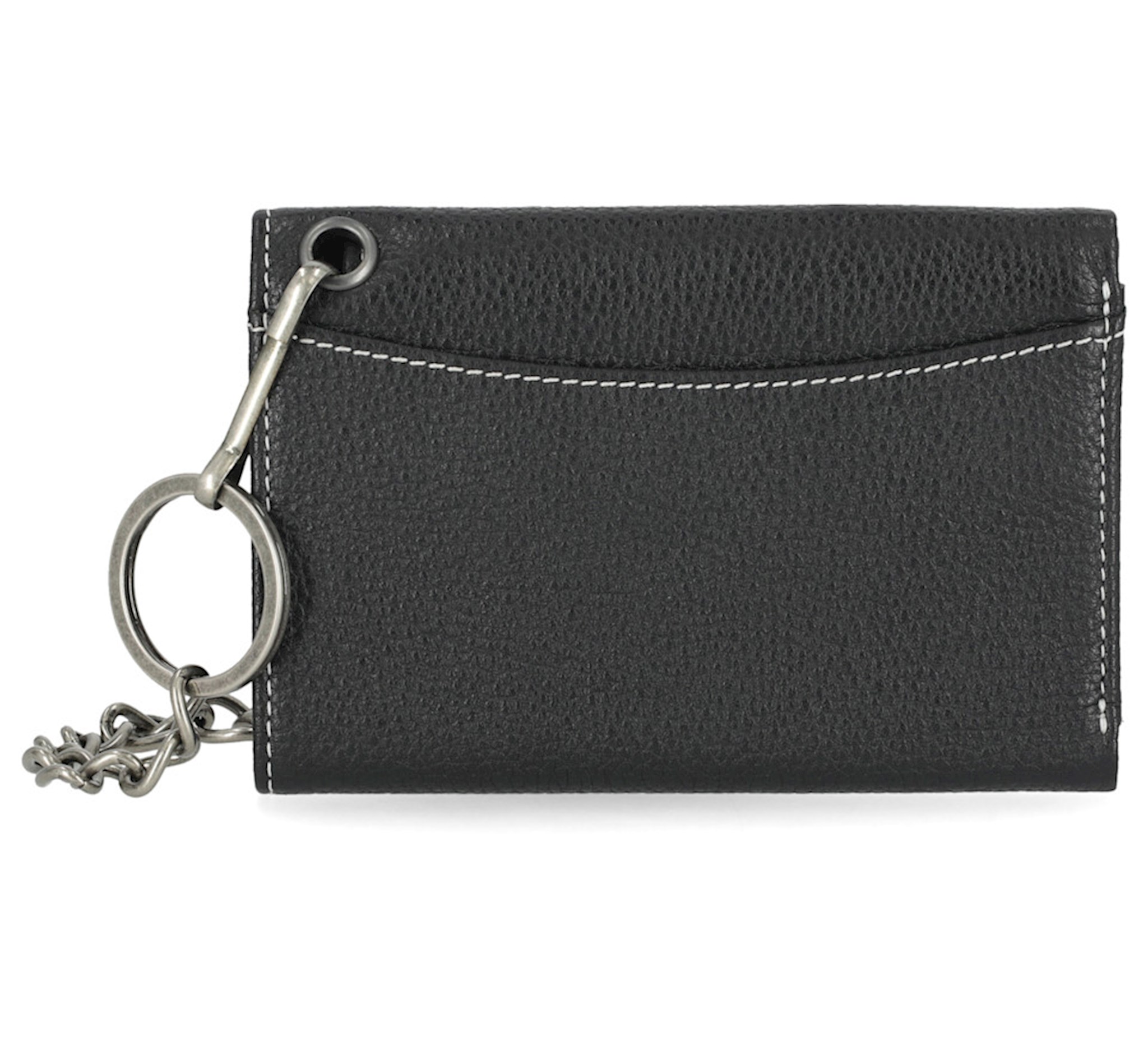 RFID protection. Genuine leather. Antique nickel finish. Embroidered long B&S logo. Snap closure. Interior ID window. Interior credit card slots. Billfold pocket. Exterior back slip pocket. Detachable chain.