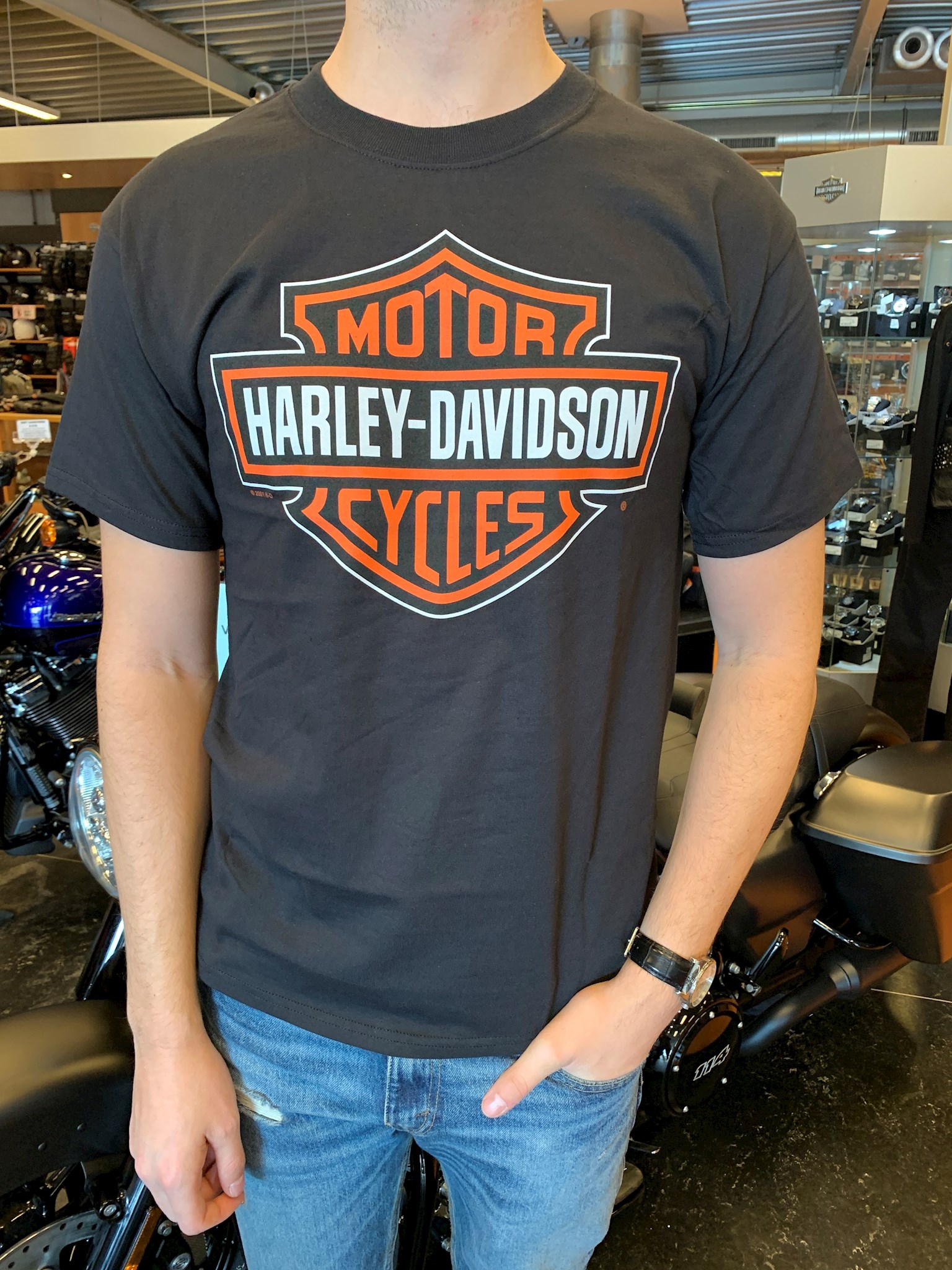 Harley-Davidson® Men's t-shirt. Bar & Shield printed orange logo on front. Back features Motor Saloon Harley-Davidson® dealership graphic. Made of 100% cotton.