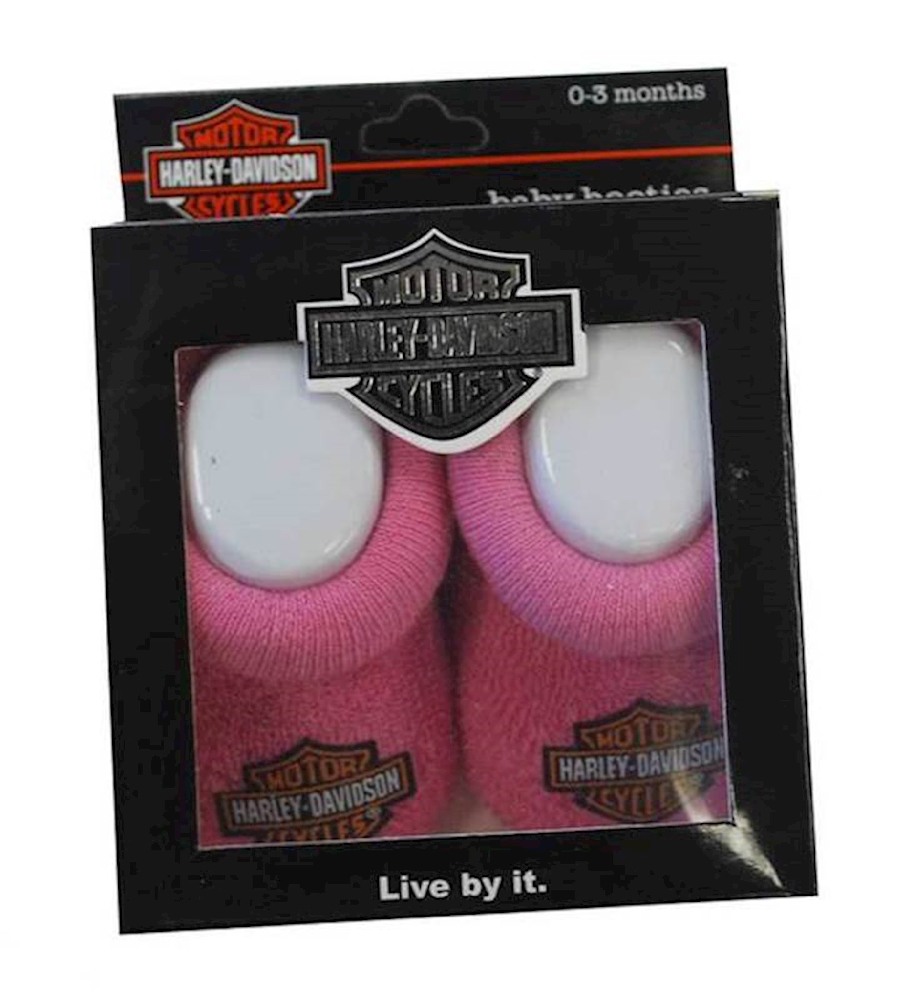 Harley-Davidson® Baby Girl's Bar & Shield® Stretch Terry Booties, Pink, S9LGL20HD. Even though you little girl can’t walk yet, she’ll be cute air-pumping her little feet with these soft terry cloth cotton Bar & Shield® logo booties. The best thing is that her little feet will stay warm, too. Sized for infants, newborn to 3-months. They are perfect any little Harley® baby girl! Manufactured under Harley-Davidson® license by SGI Apparel Group®, a manufacturer known for creative designs and high quality children's sleepwear, sportswear, newborn/infant layette sets, accessories, and adult loungewear.